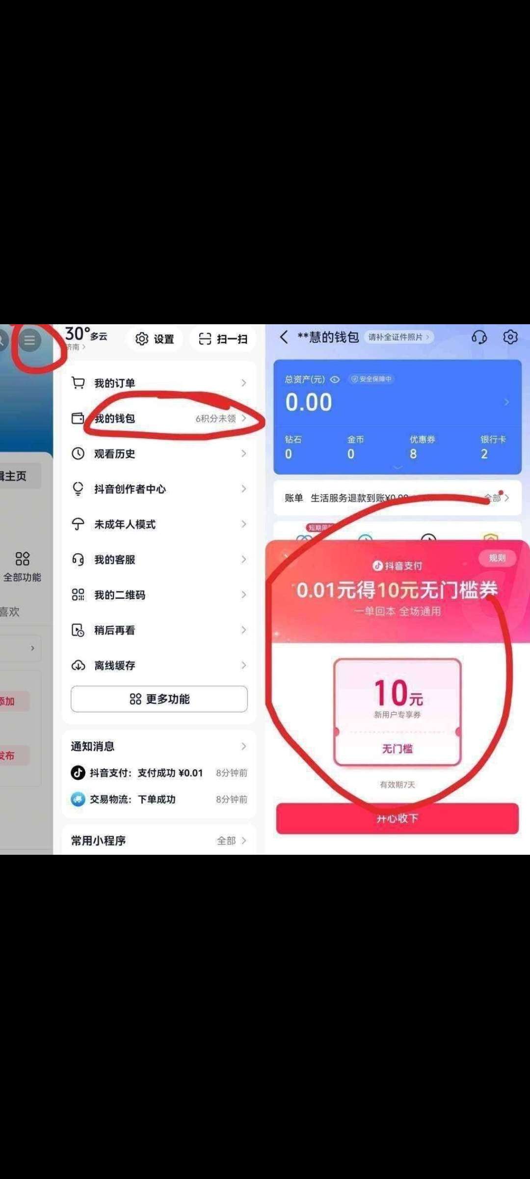 用原来的手机号重新创建一个小号如图,活动的新人红包,可能提视参加不了,不要慌会自动到余额,5.01邦卡提现,提现完成之后,退一下钱包界面,再进去,就会出现一个0.01购买的10元无门槛红包,看图操作创建