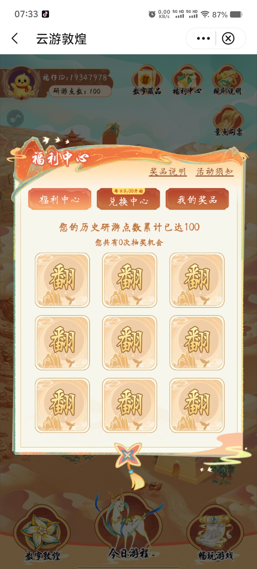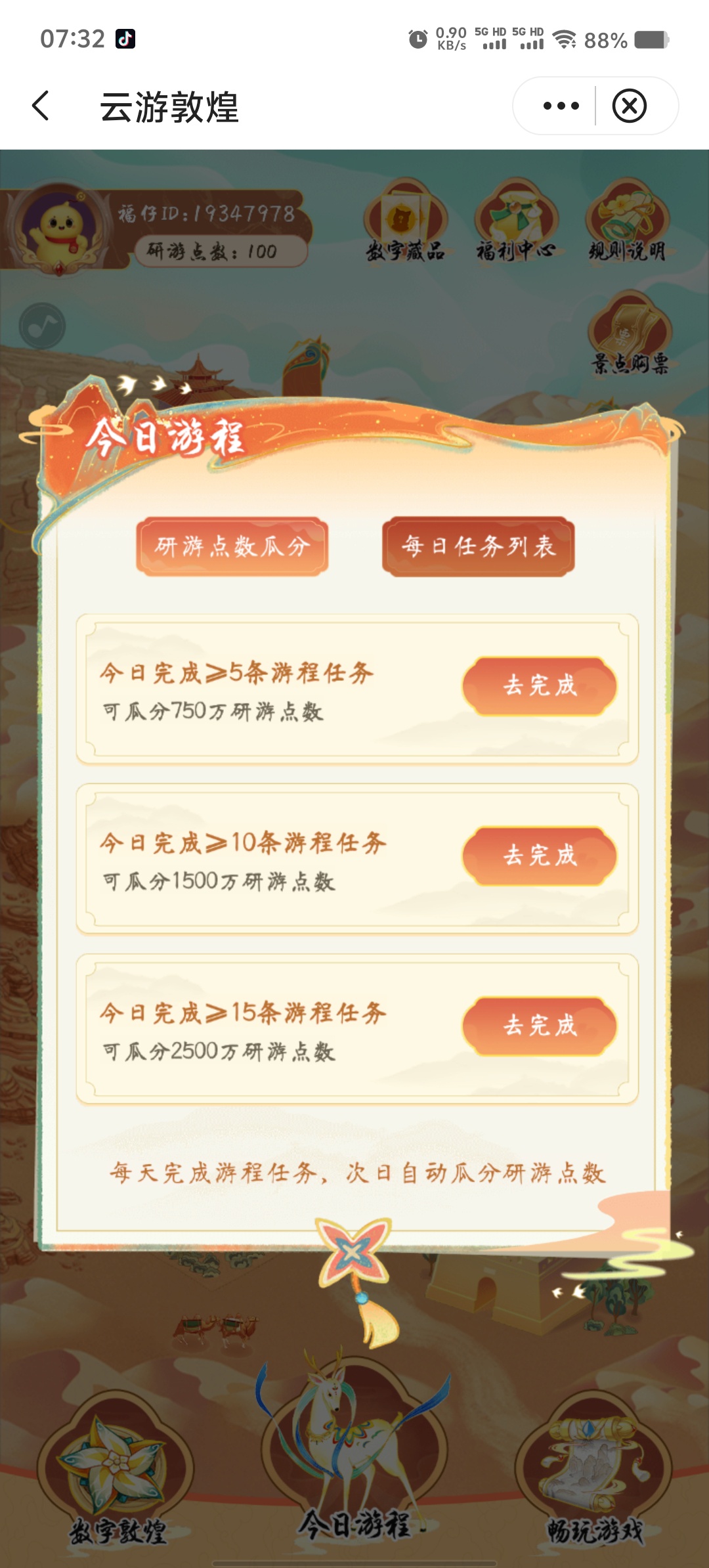 【参与方式】打开“中国银行”APP搜索【福仔云游记】进去,点【云游敦煌】进去,每天在“今日敦煌”和“畅玩游戏”完成简单的浏览和小游戏任务得点数,累计点数可以在【福利中心】抽奖,刚中2.88元微信立减金,非必中