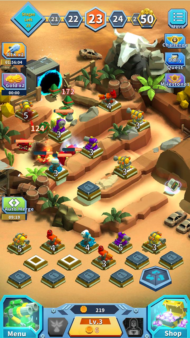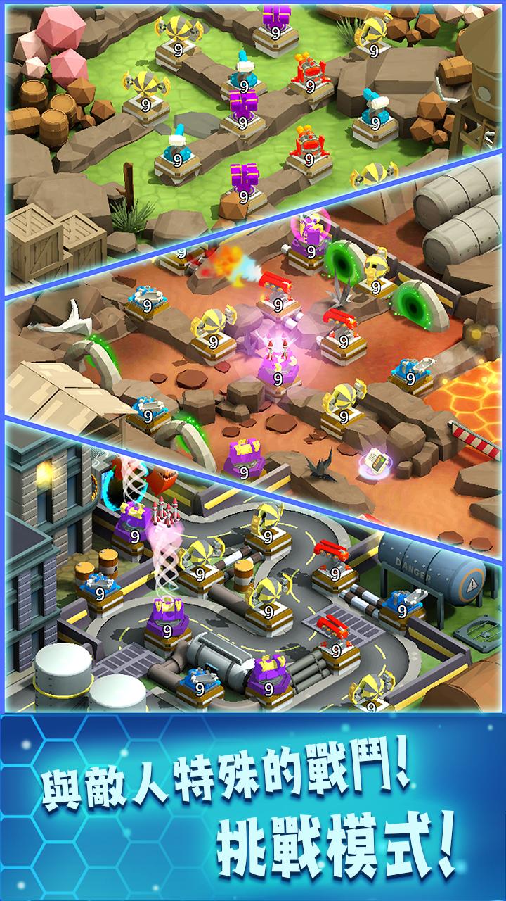 【游戏简介】用一根手指轻松享受游戏的乐趣! 快来加入「炮塔合并塔防」吧! 【游戏特点】 # 16种独特的炮塔! # 由1500多个关卡组成的15个世界地图! # 利用炮塔的固有技能挑战BOSS! # 击败BOSS或闯过关卡即可获得丰厚的奖励! # 在挑战模式中使用特别的效果和同一种炮塔与敌人展开战斗! # 可以通过每日任务和成就获得丰厚的奖励! # 在全球排行中与全世界的玩家竞争! 【游戏方法】 1.合并同一