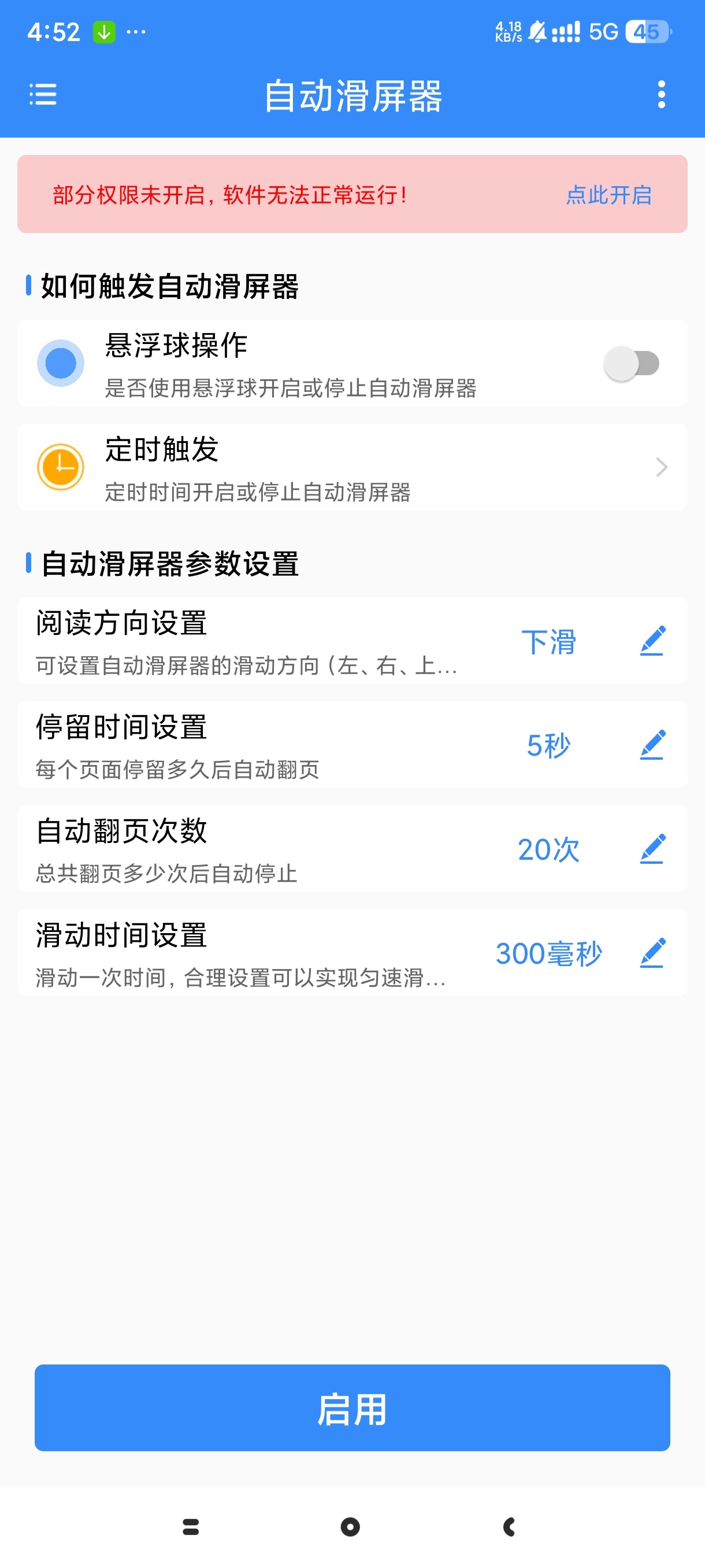 【应 用 介 绍】:可以自动滑动屏幕的APP,可以帮助用户在阅读电子书时自动翻页,或在浏览短视频时自动翻页。软件支持设置屏幕滑动方向(左、右、上、下、自定义路径)、滑动次数、屏幕停留时间、自动停止时间等参数。使用时,除了定时触发以为,用户还可以通过点击悬浮球触发滑动功能。