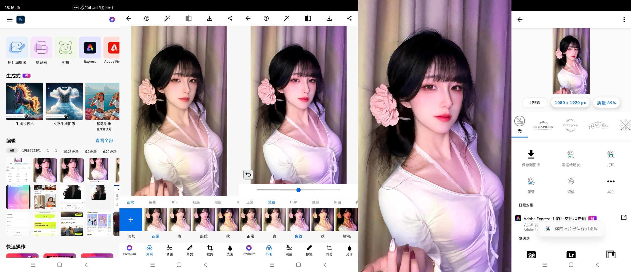 【官方介绍】:Photoshop手机版是一款功能丰富的图片处理软件,内置了强大的图像编辑器,用户只需导入照片即可开始进行编辑,软件内提供了最基础的旋转、剪裁、填充、文字添加等操作,还提供了实用的魔棒、切片、吸管、污点修复、画笔、橡皮檫、钢笔等功能,全方面帮助用户快速制作出一张出色的作品!Photoshop手机版还支持自动修复、Raw、TIFF、瑕疵移除、艺术拼贴画、颜色弹出工具等功能,有需要的朋友欢迎下载体验!