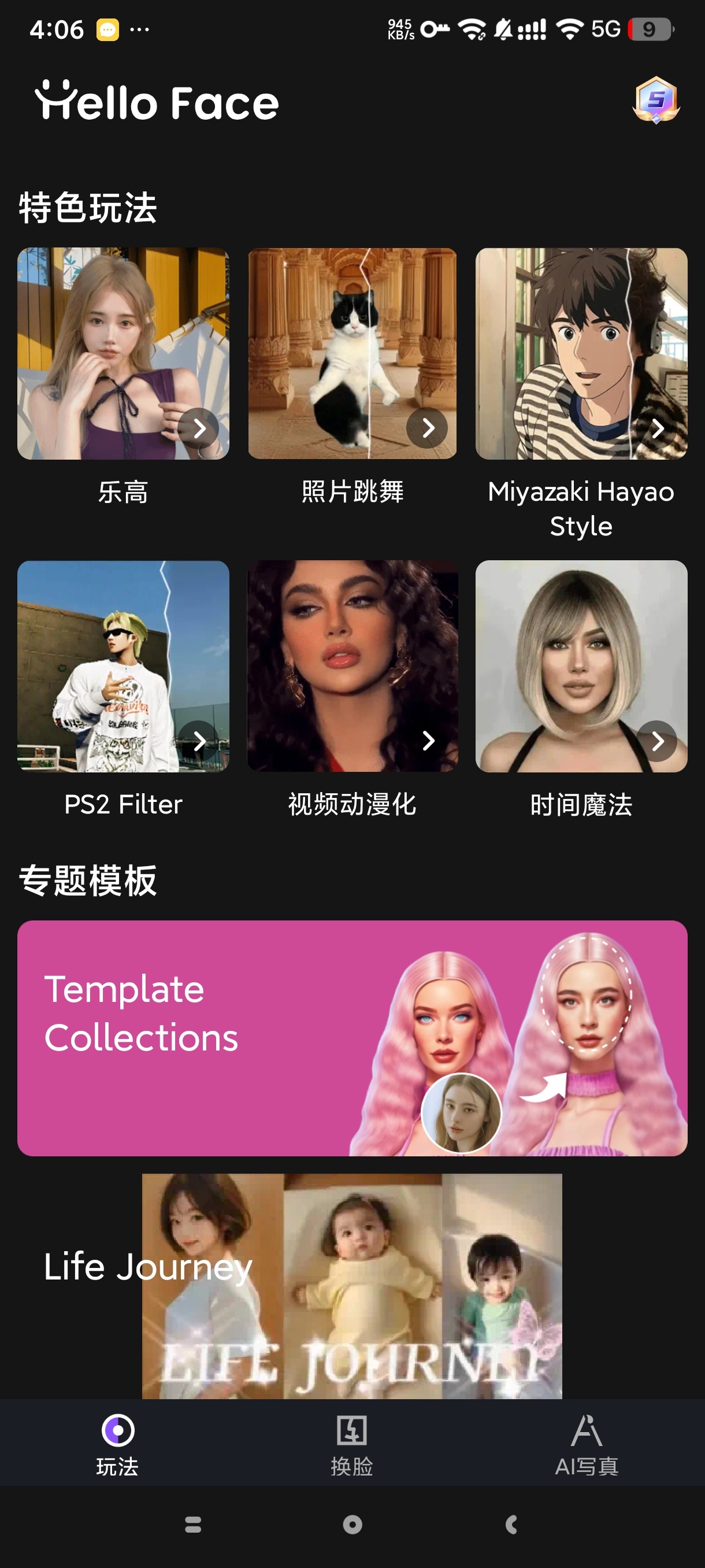 【应 用 介 绍】:HelloFace全解锁安卓版是一个可以使用模板进行AI换脸的软件,这个版本是已经解锁会员的版本,大家可以通过这个软件达到视频中的动物跳舞,或者是一键套用热门模板视频的软件,通过这个软件,不需要会摄影技术就可以成为专业摄影师的软件,此版本解锁VIP。