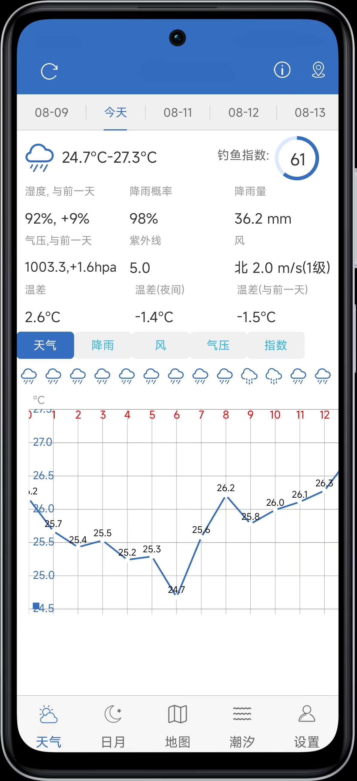 想知道今天能不能好好钓鱼打开它,一眼看清适合钓鱼的指数、水温、气压,还有风力风向、降水概率。精准定位钓点,未来几天天气早知道,助你选对时机,渔获满满。简单直接,钓鱼前查一查,出门更放心。