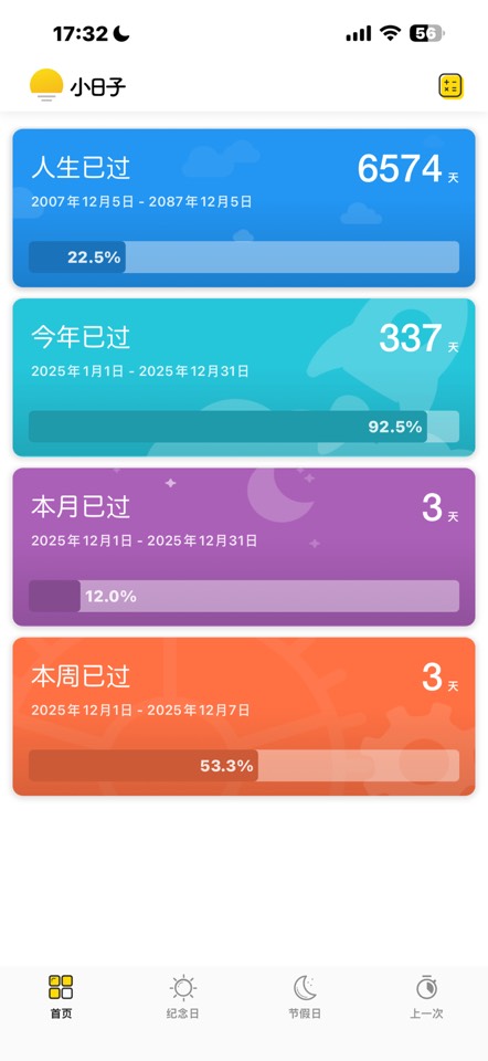 - 日期类型:正数日、倒数日、节假日、人生已过、今年,本月,本周进度