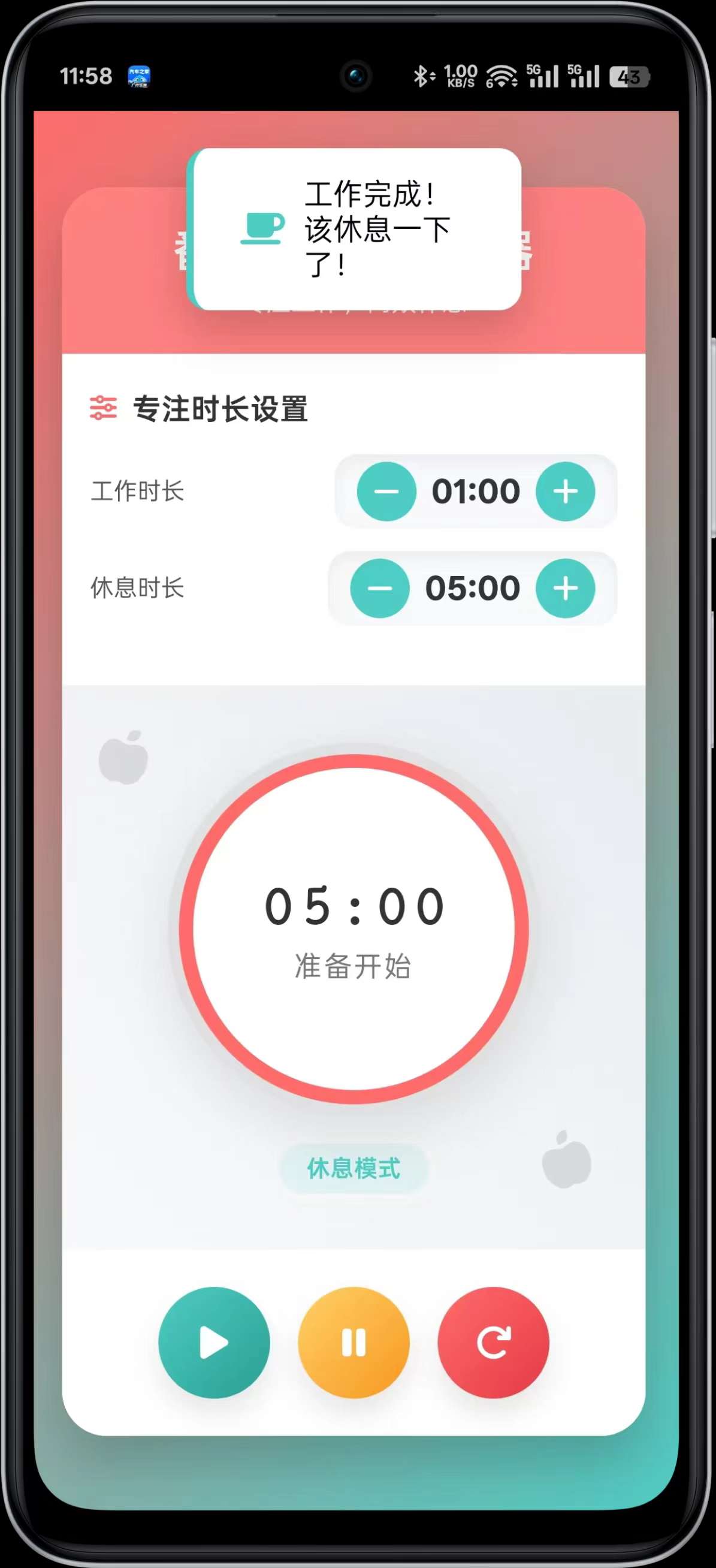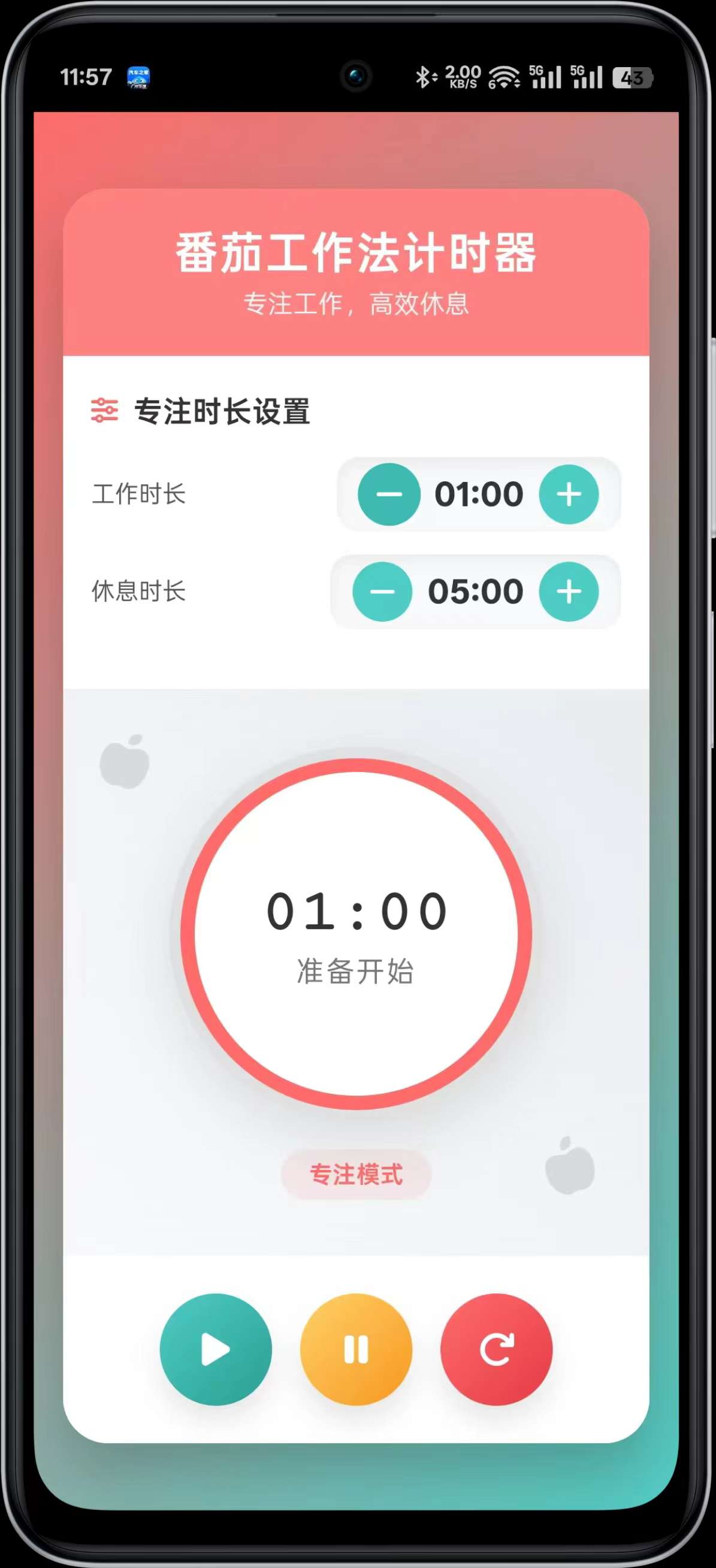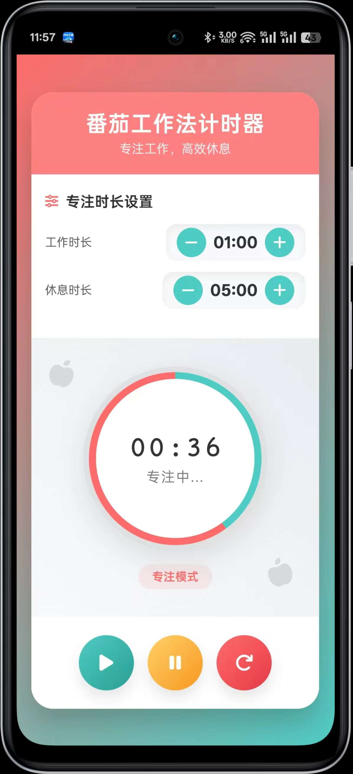 【软件介绍】:番茄专注是一款提高专注能力的安卓APP,帮你告别拖延!自定义专注时长与休息时间,期间隔绝干扰、专注深耕。专注结束后,闹铃准时提醒休息,让大脑适度放松。极简操作零学习成本,用“专注-休息”的科学循环,轻松培养自律习惯,高效利用每一刻学习时光~