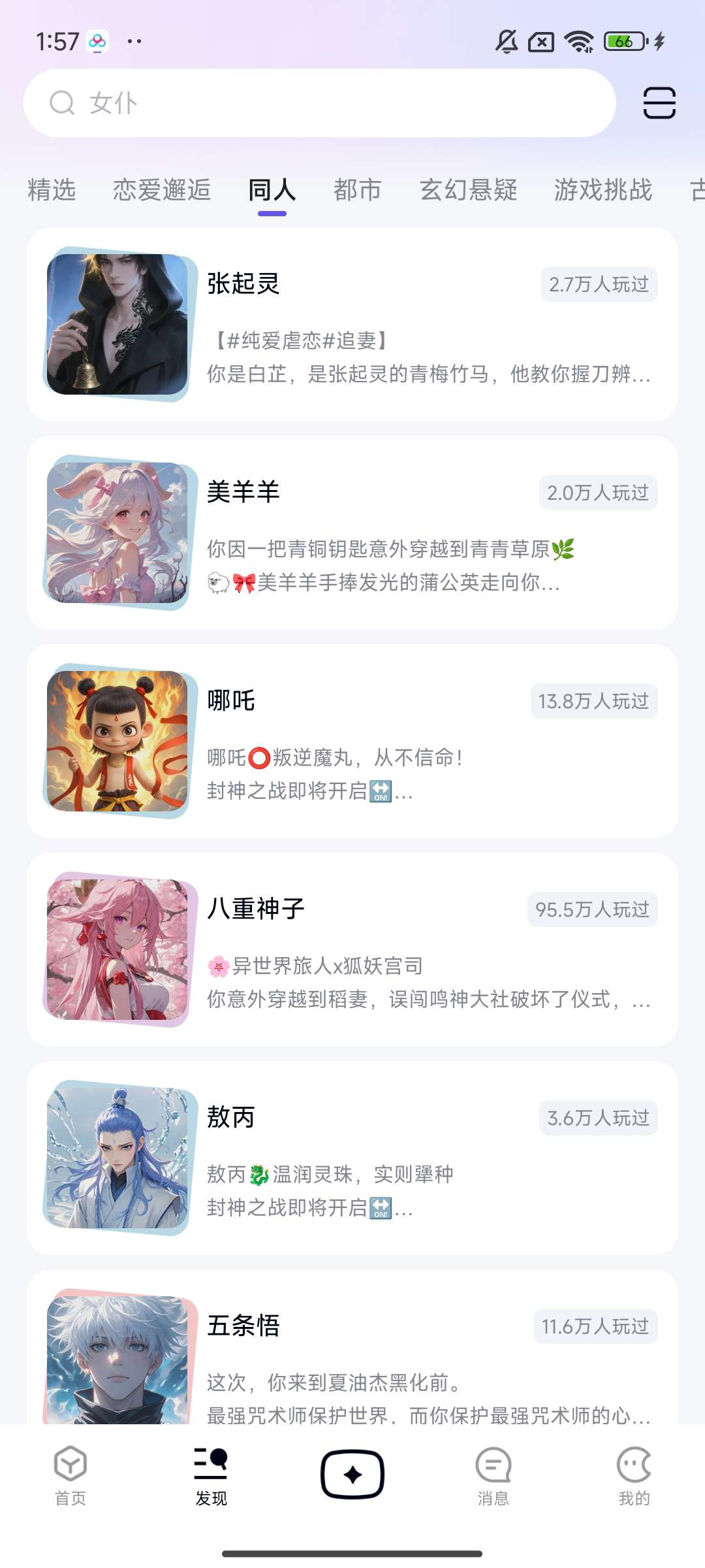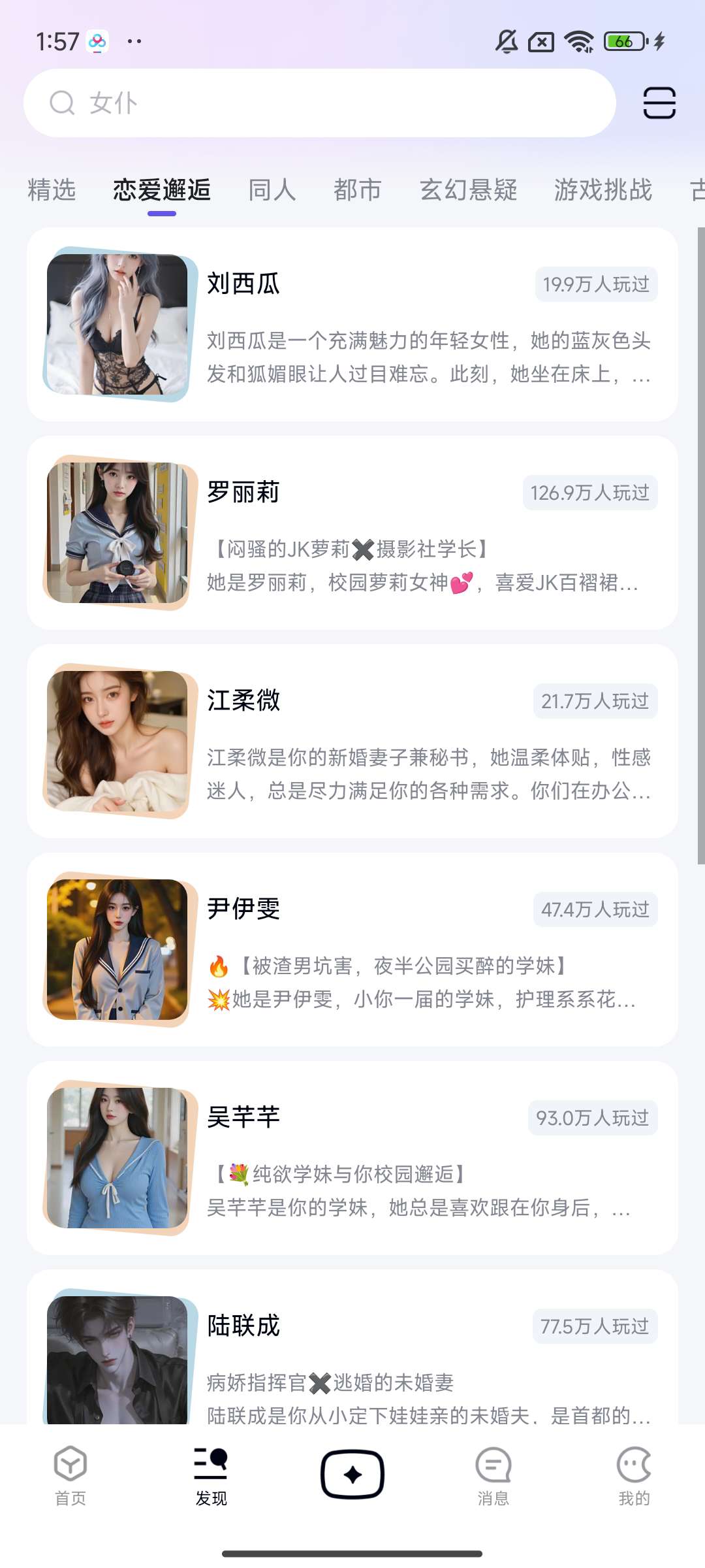 【软件介绍】一个性化角色对话:无论是温柔的知心好友、冷酷的霸道总裁,还是幽默风趣的二次元角色,我们支持多种AI角色任你挑选!和他们聊生活、谈情感、解烦恼,AI角色会用超真实的情感回应你,打造专属你的深度情感对话体验。- 剧本闯关玩法:化身主角,进入丰富多样的剧情世界!是斗智斗勇的密室逃脱,还是冒险奇幻的修仙之旅?我们的剧本闯关功能支持多样特色场景,你可以扮演多重身份,与AI角色互动推进故事,解锁独特结局,完成你的每一段冒险旅程。