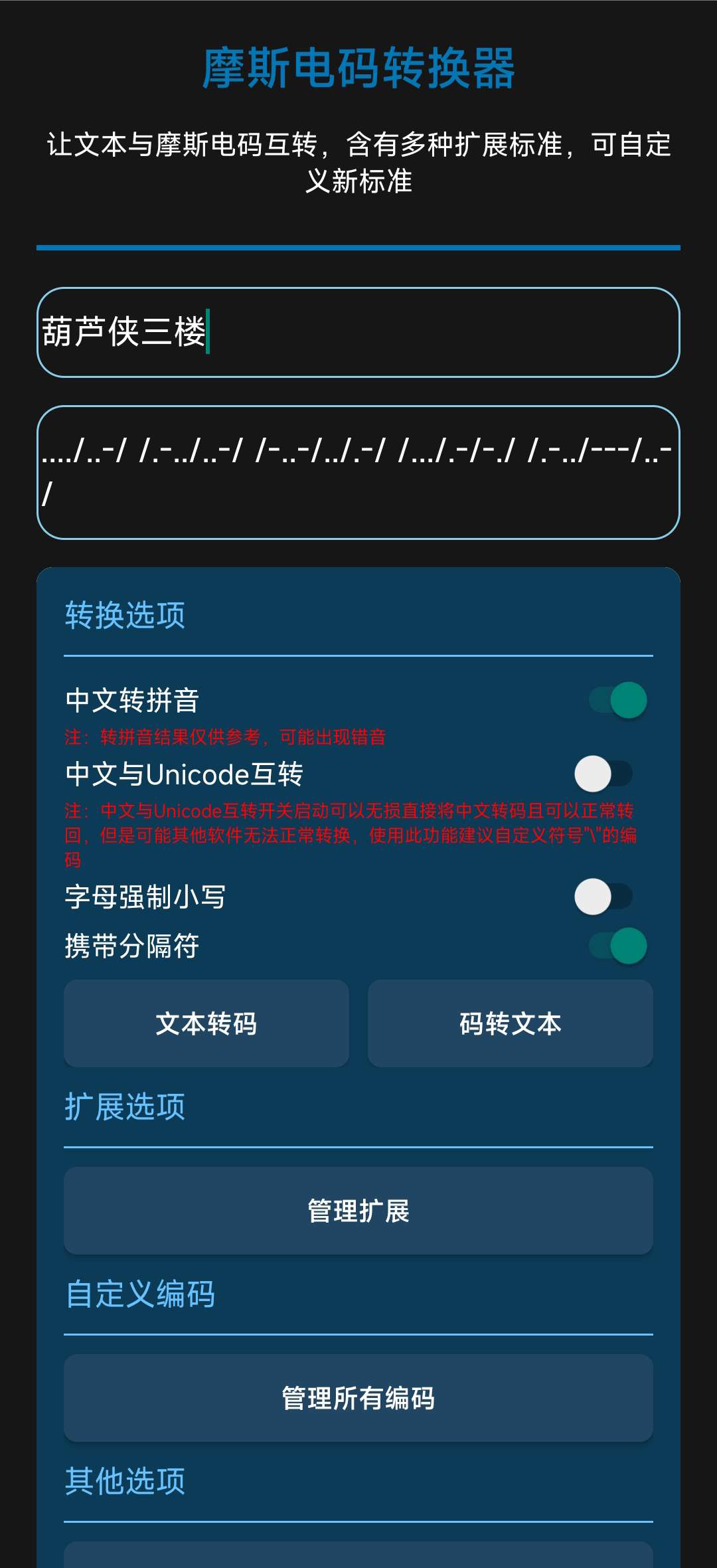 【应用简介】可以实现摩斯电码和文本互转,支持多种编码,可以自定义编码,可播放摩斯电码,免费无广!