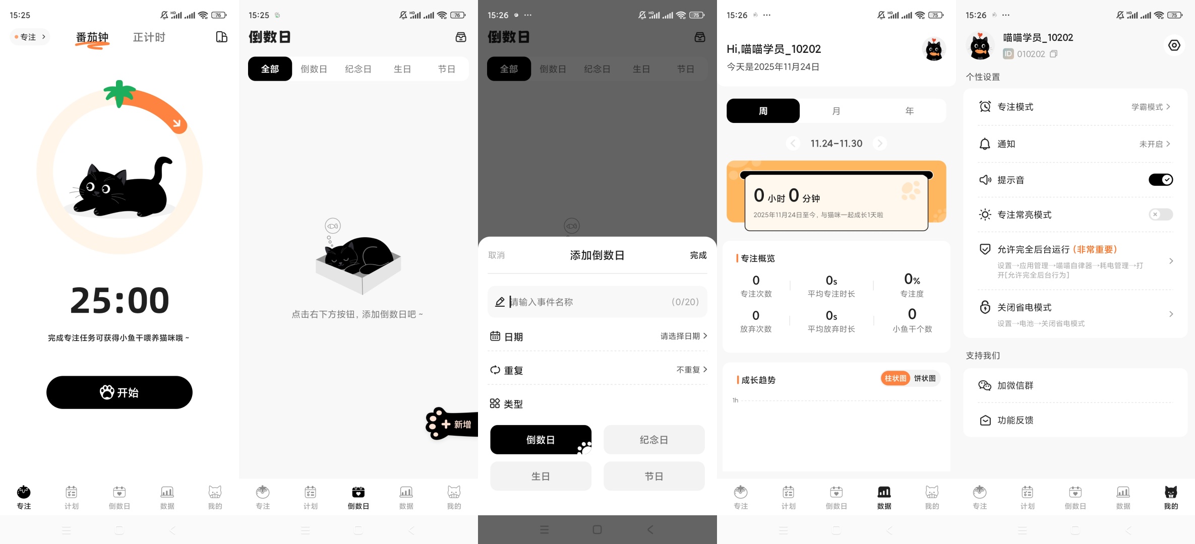 【官方介绍】:喵喵自律器,专为需要集中注意力的用户设计的自律APP。提供多种模式,适用于不同场景,支持打卡签到,并以图表形式呈现,帮助用户随时关注自律情况,提升效率。可以通过专注模式获得小鱼干,云养猫咪,获得暖心鼓励,记录生活进步,感受成长。
