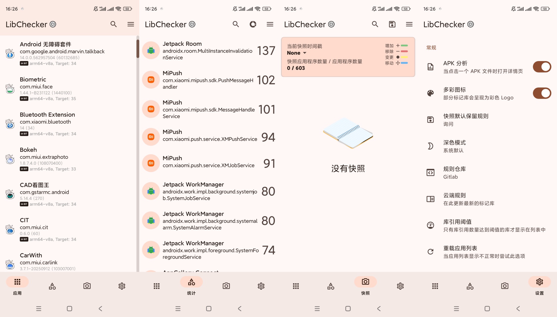 【官方介绍】:LibChecker是一款超棒的查看系统内部架构的手机应用,支持对app的部分基础架构数据进行修改编写,包括app 的ABI架构查看和统计(32 位 / 64 位)、原生库的查看、四大组件的查看(服务、活动、广播接收器、内容提供器)。LibChecker在对比app升级前后架构的快照变化后,会对apk文件进行详细的分析、统计手机各个库的使用频率,以图表的形式来展示。软件操作起来也非常简单,上层的应用软件只需认字或图标即可进行操作,下方的功能菜单栏中,分别有应用列表、统计、快照和设置,其中应用列表展示了手机现已安装的全部游戏或者app。设置菜单中可以有很多选项进行操作,譬如:主题背景颜色、APK分析、规则仓库、语言以及云端规则等等。