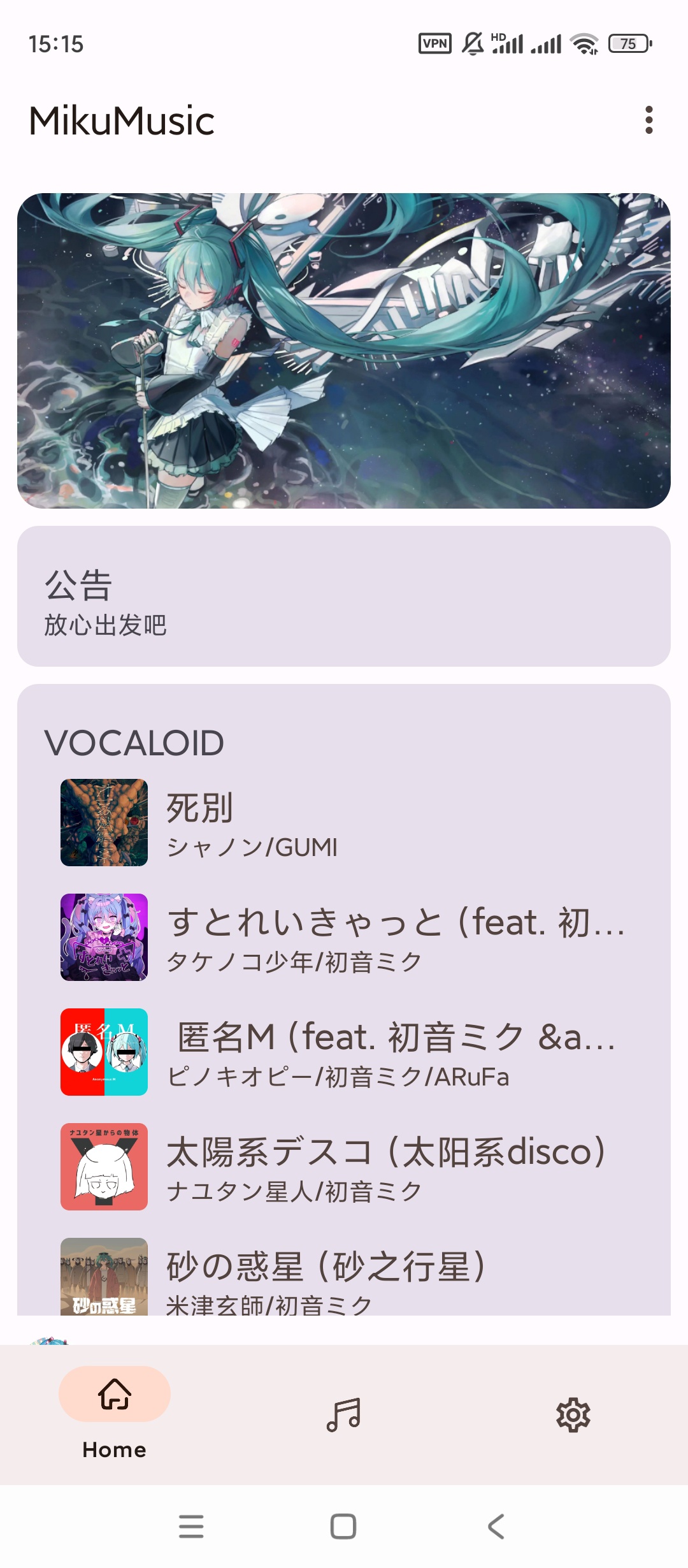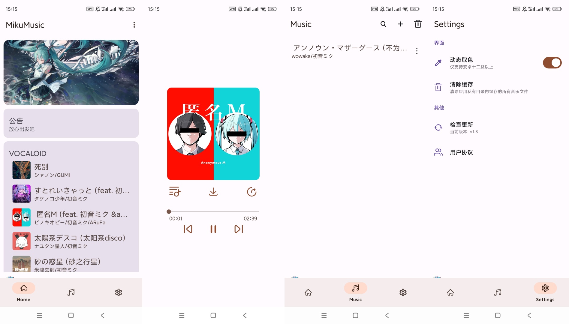【官方介绍】:MikuMusic是一个初音主题风格的音乐播放器,专为喜欢Miku的朋友们开发。程序无广告而且设计界面简洁,可以体验全新的二次元界面,其中还有全系列的初音未来歌曲。不仅可以免费播放而且支持下载。
