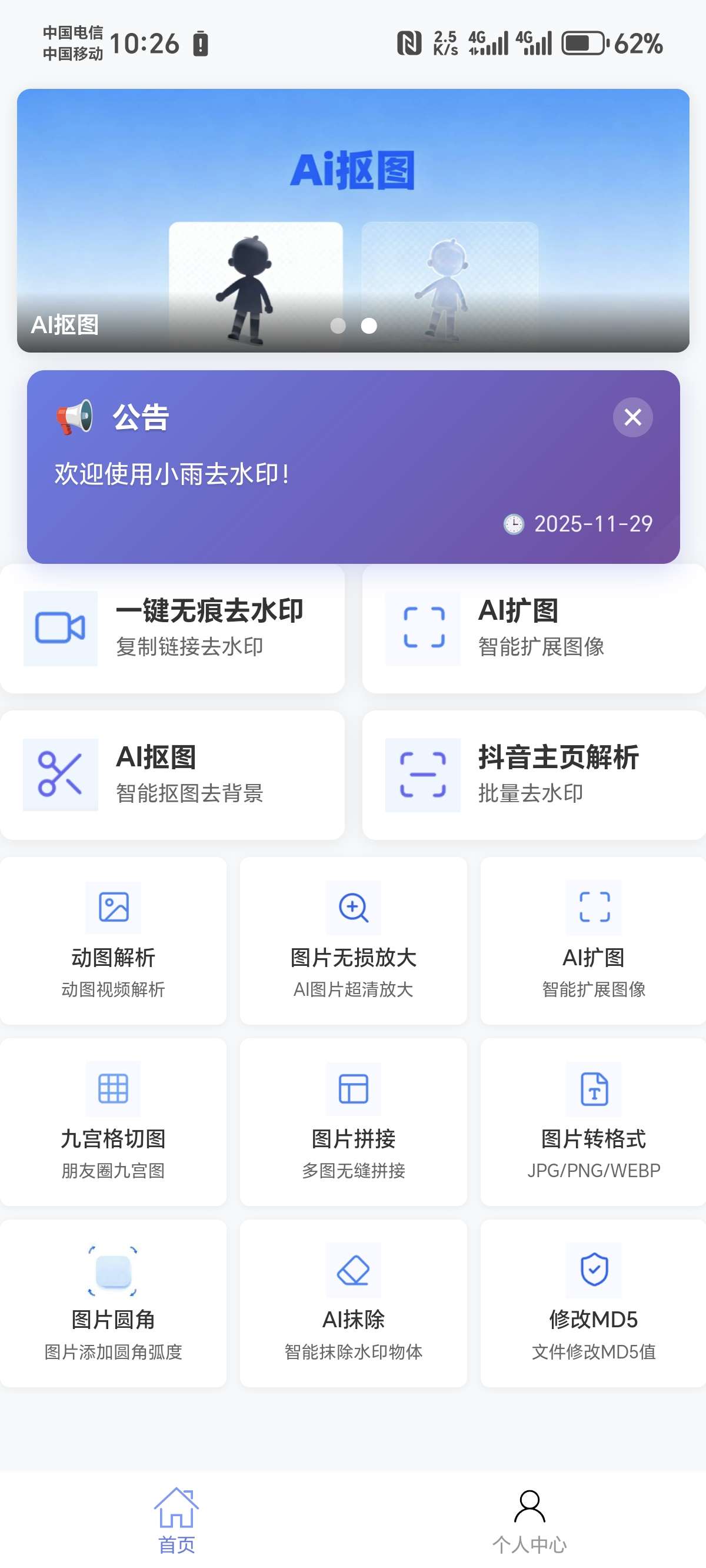 小雨去水印一款集视频解析、图片处理于一体的多功能工具。支持一键去除视频水印、主页批量解析一键下载、AI智能抠图、AI无损放大、AI抹除、图片圆角、九宫格切图、格式转换等实用功能,操作简单,高效便捷,满足你的日常创作与娱乐需求。