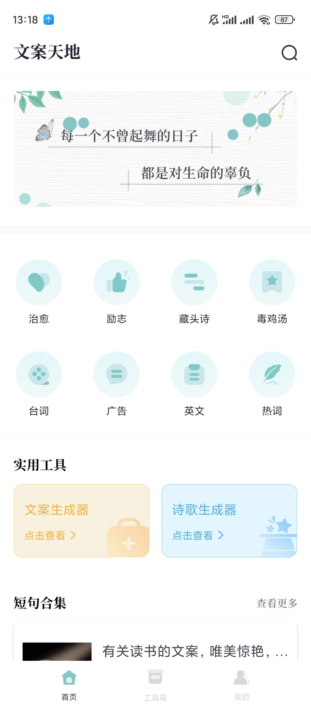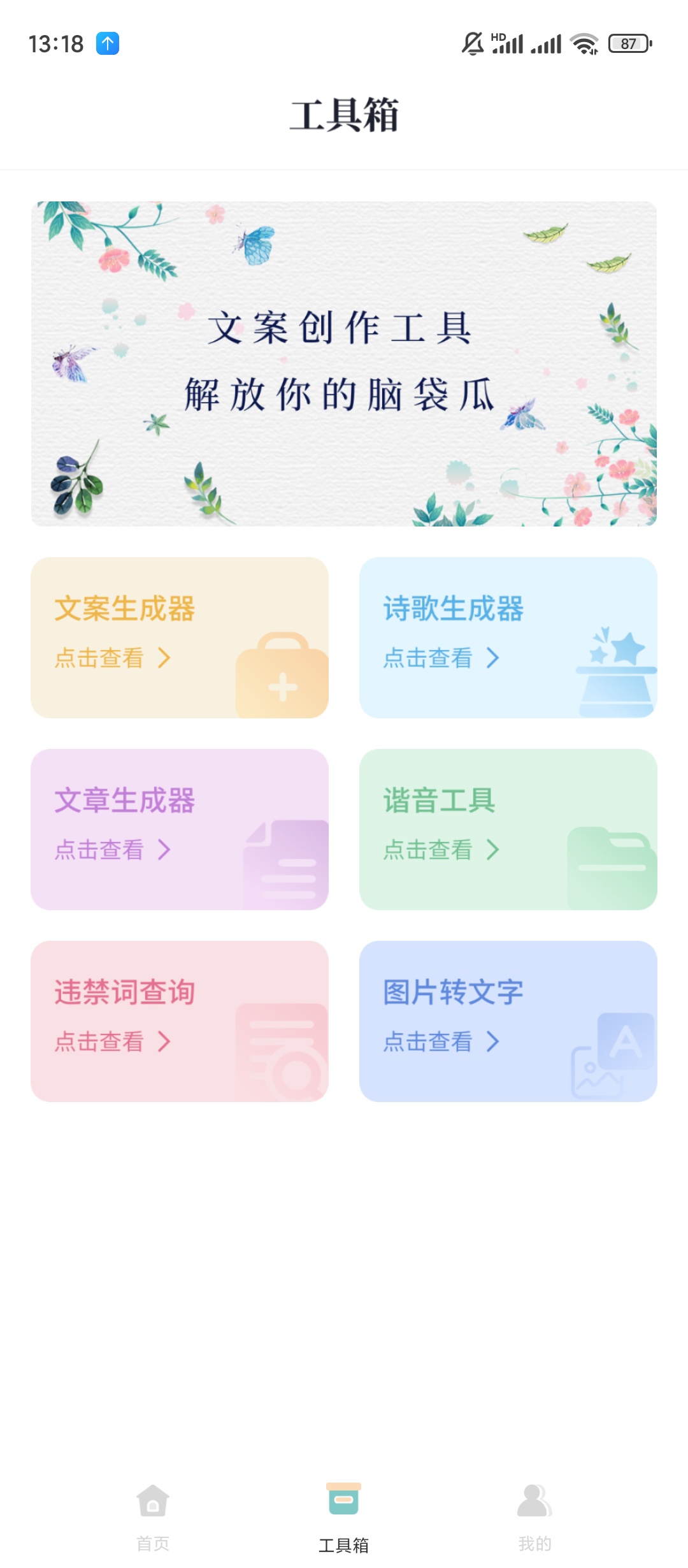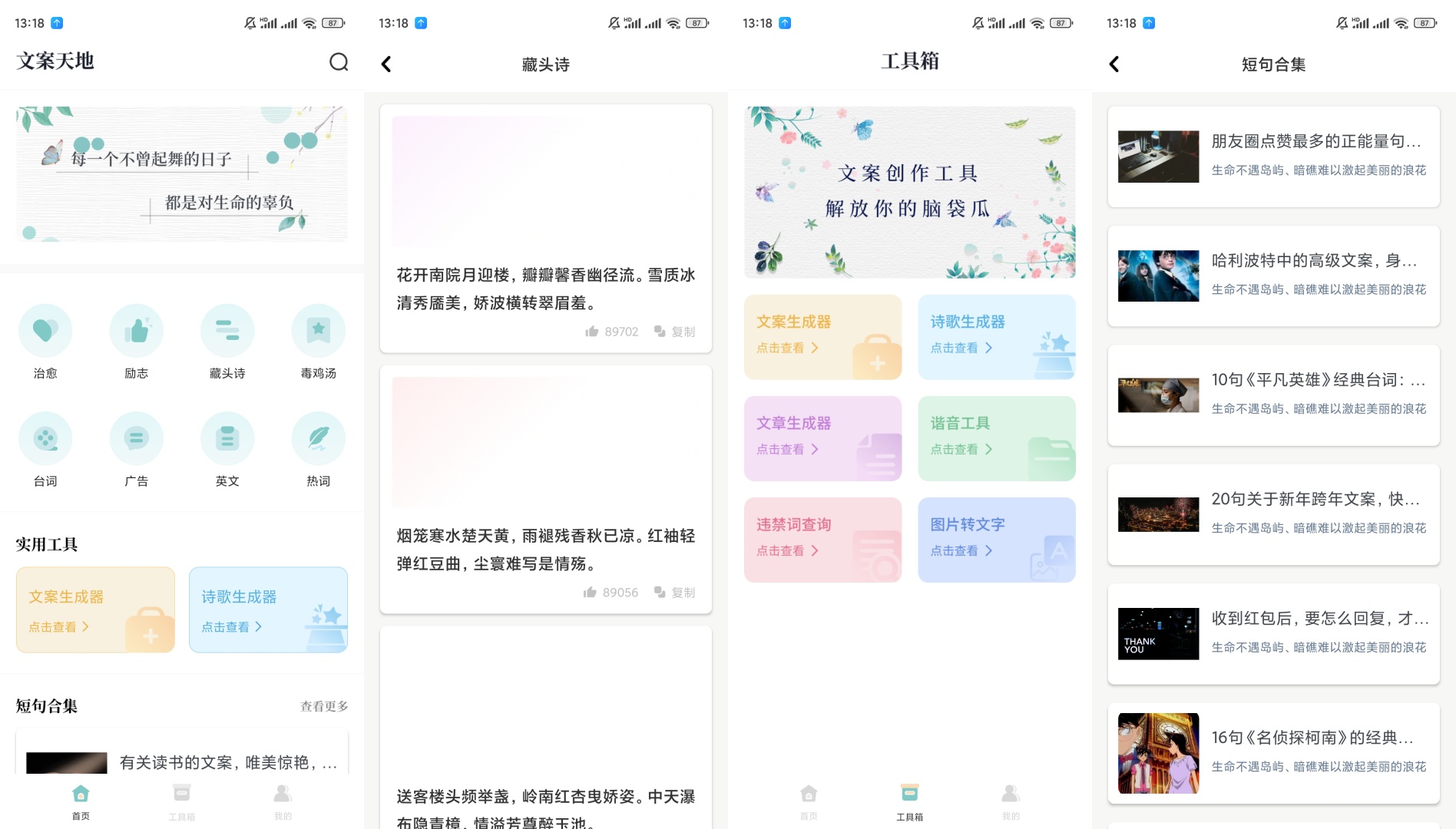 【官方介绍】:文案够app,保准文案管够。它是文案创作工具,拥有文案、诗歌、文章三大生成器,可以快速生成各种文章,比如申请书、检讨书、作文、演讲稿等,让你不动笔也能收获一篇符合要求的文章,拯救你空空如也的小脑瓜子。软件还有谐音工具,可以发现许多高校有趣的谐音梗。
