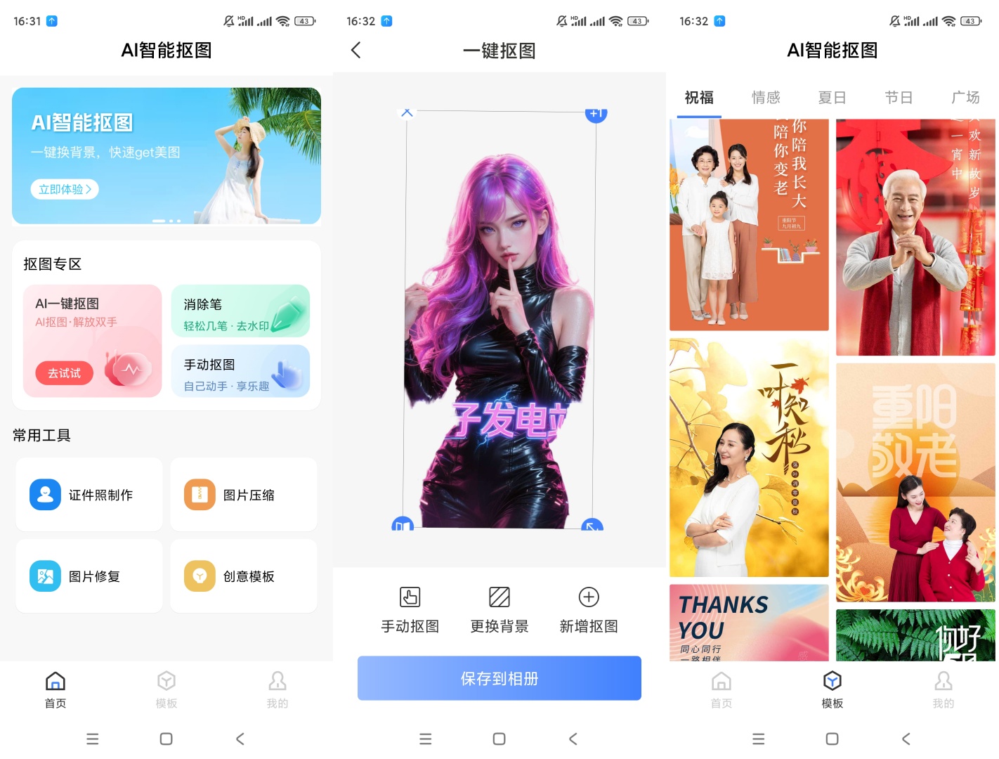【官方介绍】:AI一键抠图宝是一款智能抠图美化工具,可以让大家轻松制作出精美照片,支持多种修图模式,满足不同用户的修图需求。可以在线一键修图自己喜欢的图片,大量修图模板素材可供使用。是大家修图的必备神器,所有修图功能都是免费的,给大家最好的图片编辑体验。