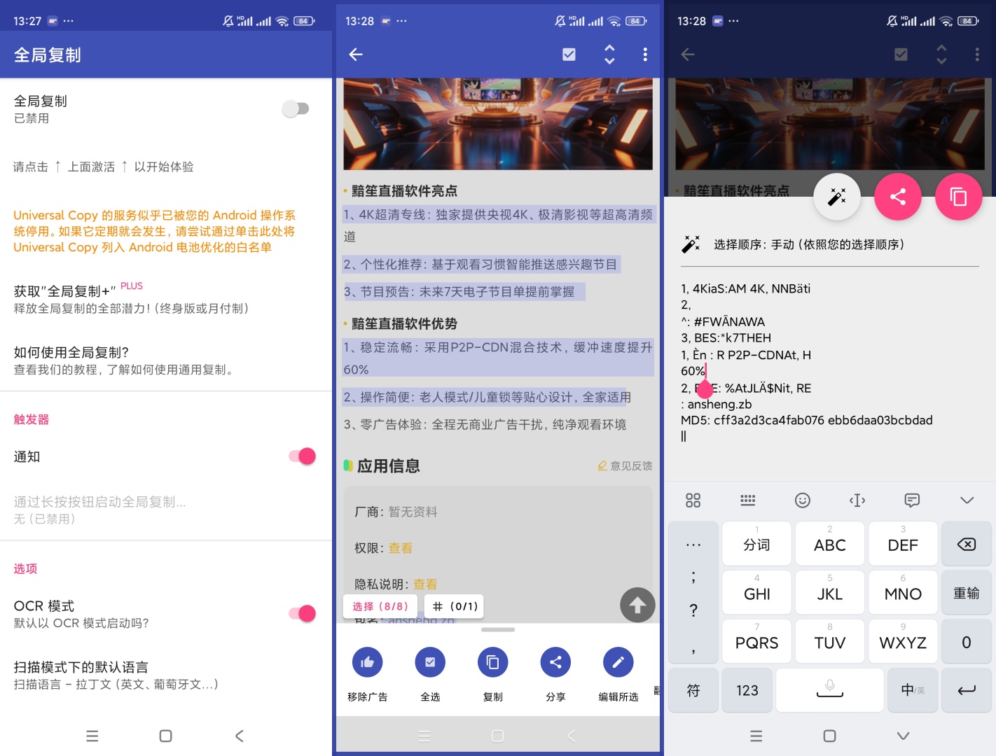 【官方介绍】:全局复制是一款很强大的软件 遇到网页或者其它地方想复制的文字复制不了 下载全局复制就对了 长按还复制不了的地方使用全局复制就可以 不仅如此它还有ORC识别文字功能哦