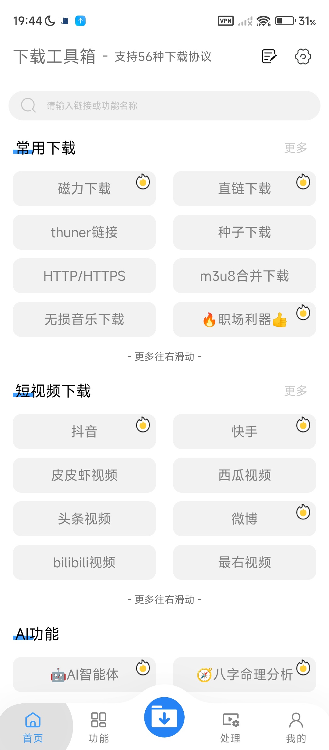 【应用简介】下载工具箱是一款国内、国外各大视频平台,同时还有网页、磁力、http,种子等等多种下载功能集一身的app!同时还有ai换脸,ai换衣等等实用功能!