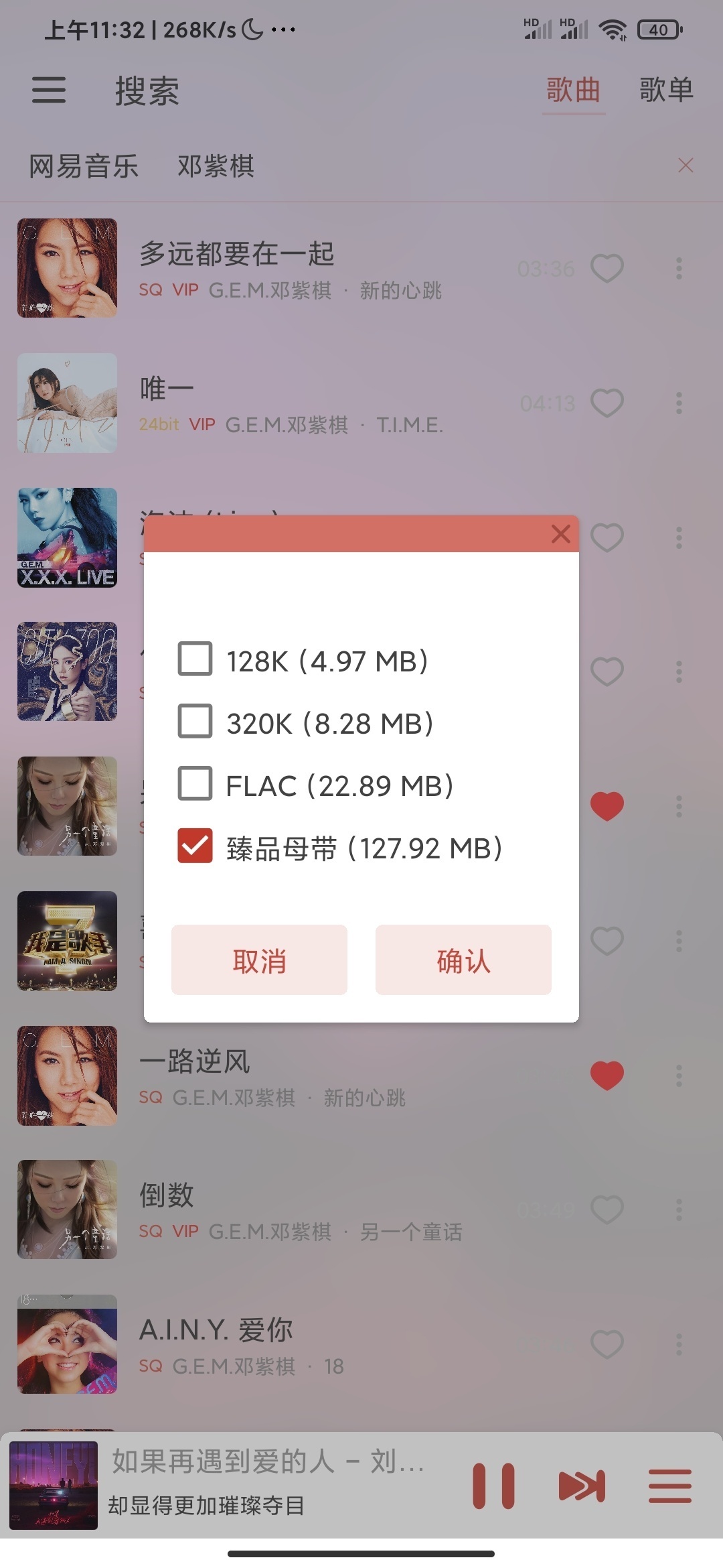 听歌及下载: 提供普通、高品质、无损APE、无损FLAC,臻品母带等多种音质