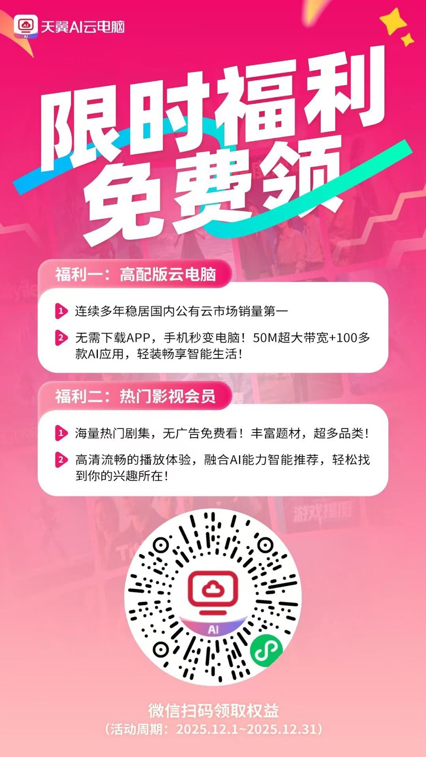 真免费!无广告!零门槛零成本体验云上办公娱乐学习,快来扫码领取。