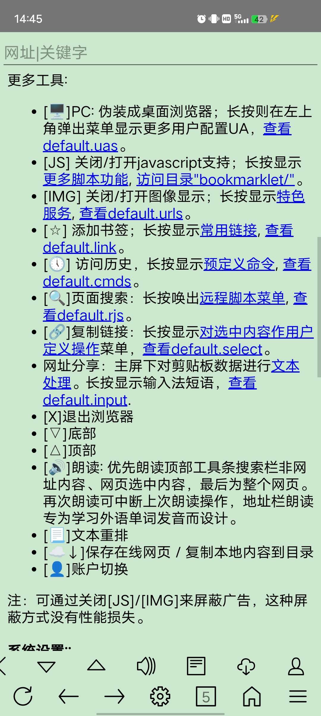 威:无穷无尽的功能,使用增强后的html5可以实现任何本地应用功能。支持使用js脚本、url服务、shell命令、内部功能链接定制菜单/(新)按钮/手势; 远程数据皆可成网站。