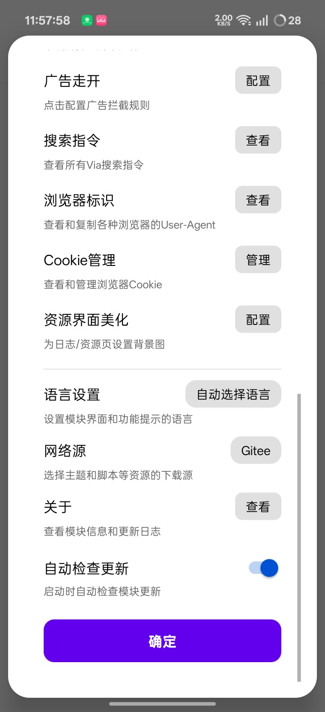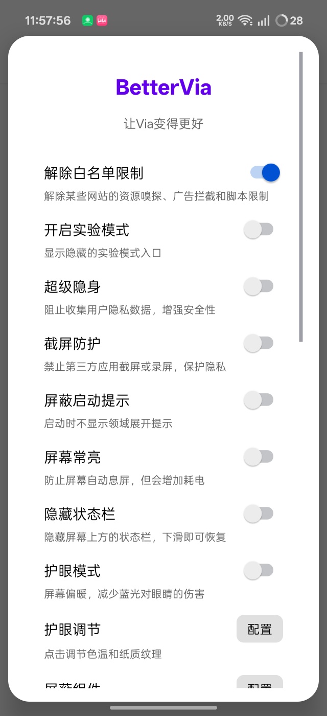 【资源介绍】:BetterVia 是专为 Via 浏览器打造的 Xposed/LSPosed 模块,旨在突破原生限制、提升隐私安全并丰富使用体验。它兼容国内版和谷歌版 Via,适配 Android 5.2 以上系统,安装后无需 Root,只需先装好 LSPosed 或 LSPatch 框架即可激活。