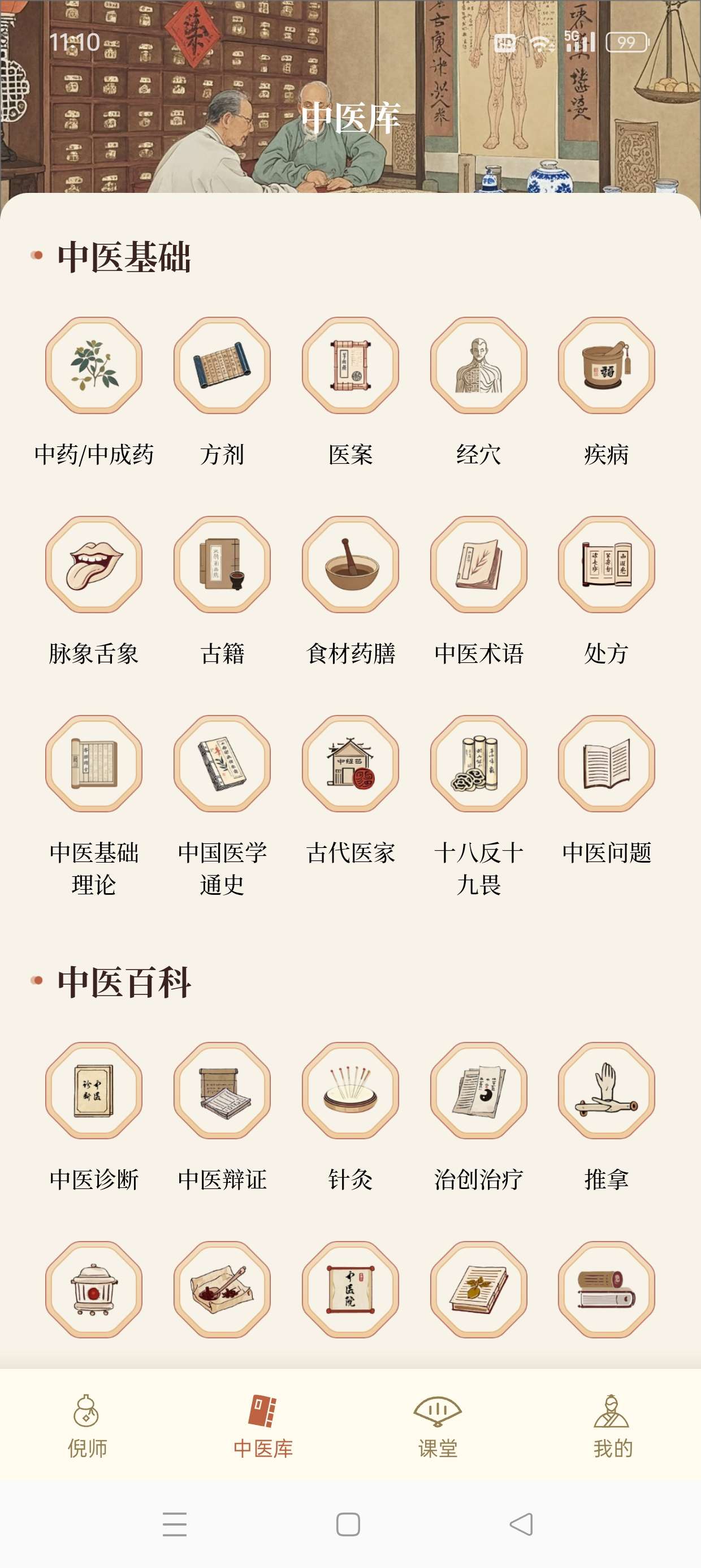 2. 智能学习系统:根据用户的学习需求和进度,智能推荐黄帝内经,伤寒论,天纪,人纪,金匮要略,神农本草经,针灸相关内容,便于用户系统性地学习中医知识。