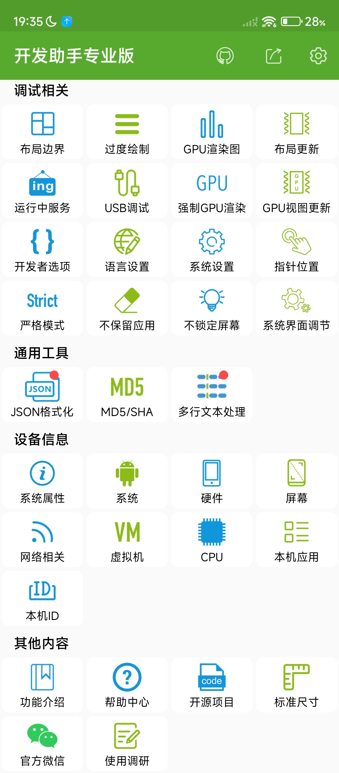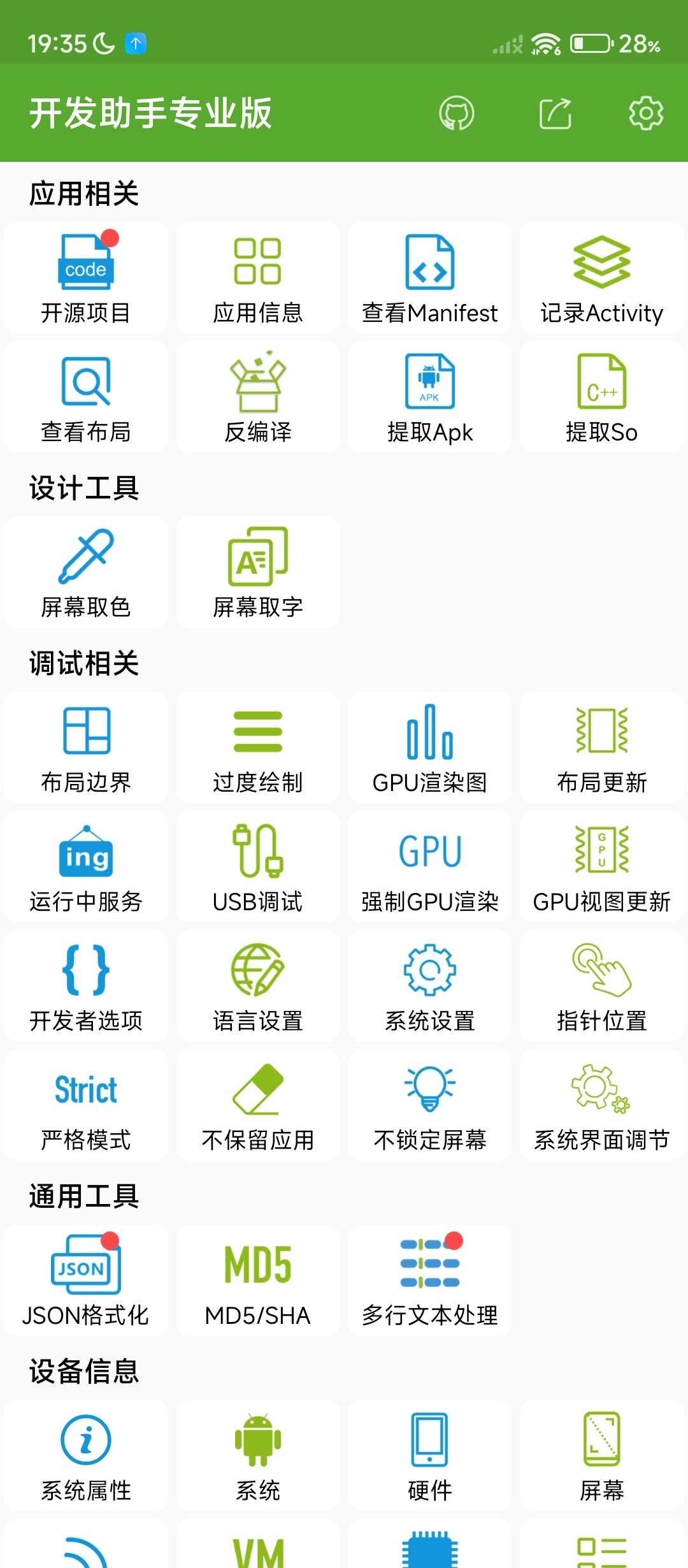 【应用简介】开发者必备的随身效率工具集,覆盖Android开发、设计、调试全场景 。可一键查看应用布局、反编译代码、提取APK,屏幕取色功能精准适配设计需求 。支持JSON格式化、MD5计算等通用工具,还能快速调取开发者选项、查看设备软硬件信息,几M体积承载数十种功能,大幅提升开发效率。