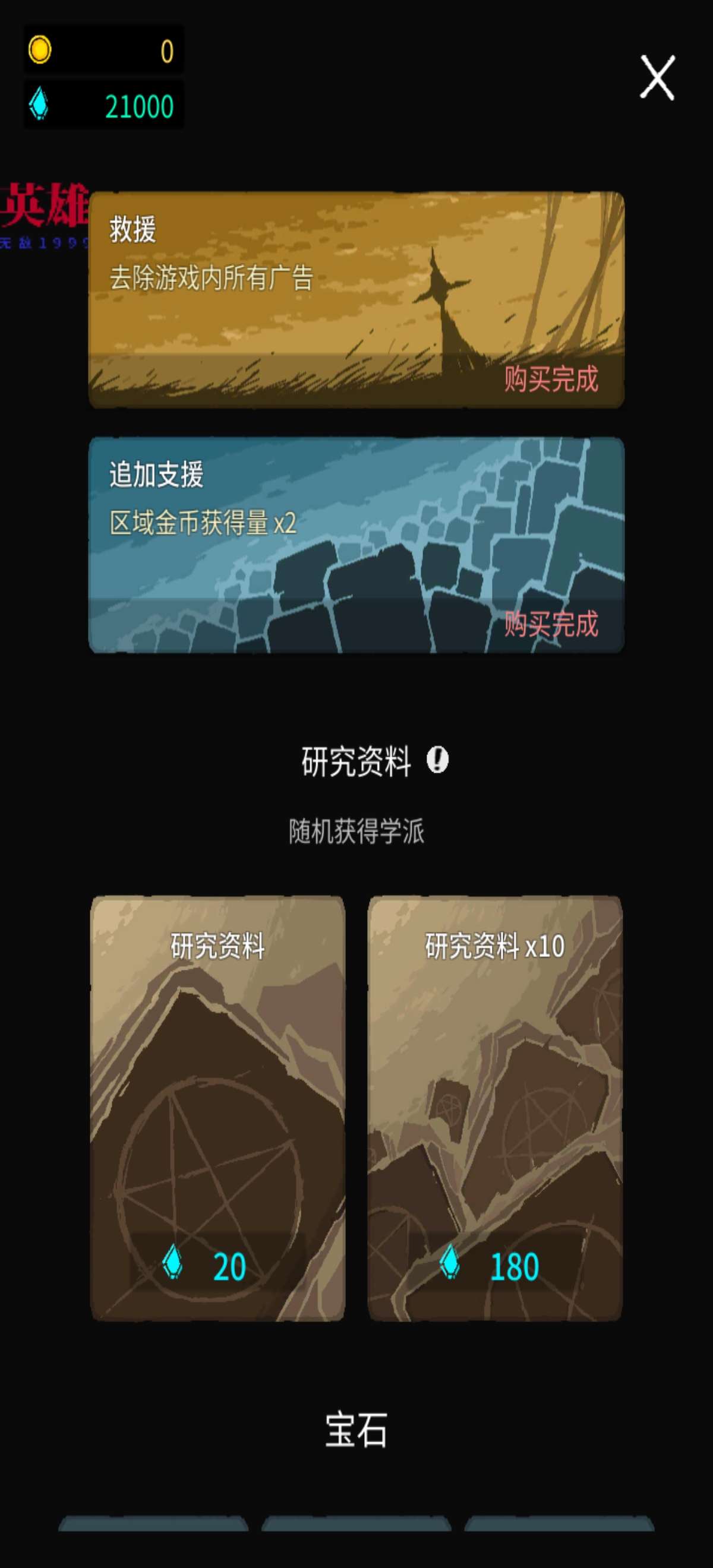 2、 开局直接在最左下角的图标里面内购购买免广告、金币倍数以及宝石,之后就可以通过宝石购买研究材料和金币了