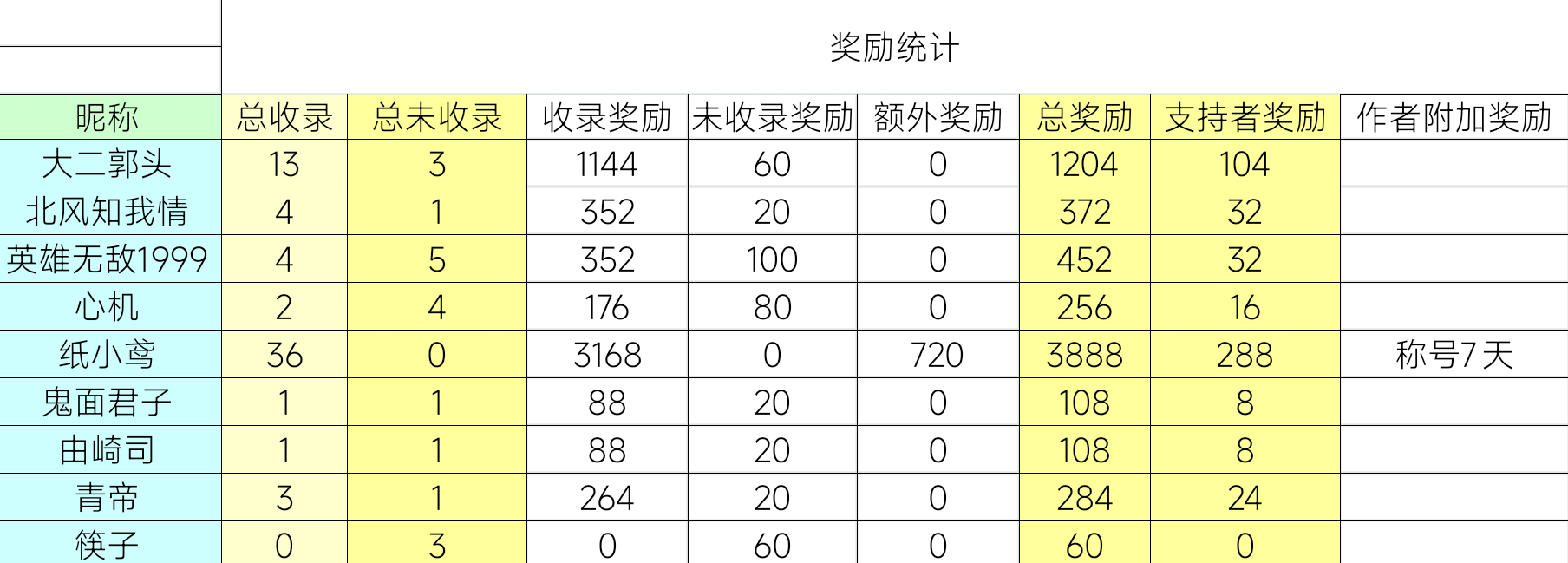 额外奖励:活动期间,未收录的帖子奖励20葫芦/贴,活动期间累计收录贴达到15及以上,额外奖励 葫芦,随机称号7天