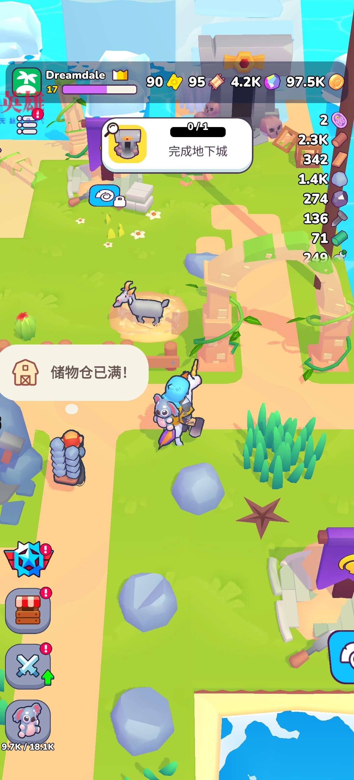 一个无所不包的地方:建造货仓来储藏你采集来的各种资源,升级建筑物和背包来加快贸易速度,从而赚取更多金币。
