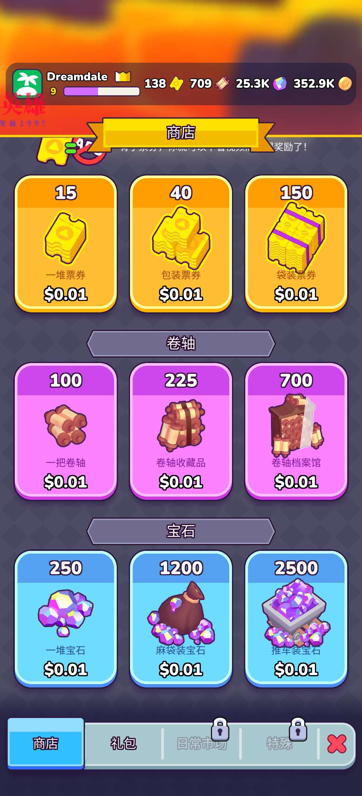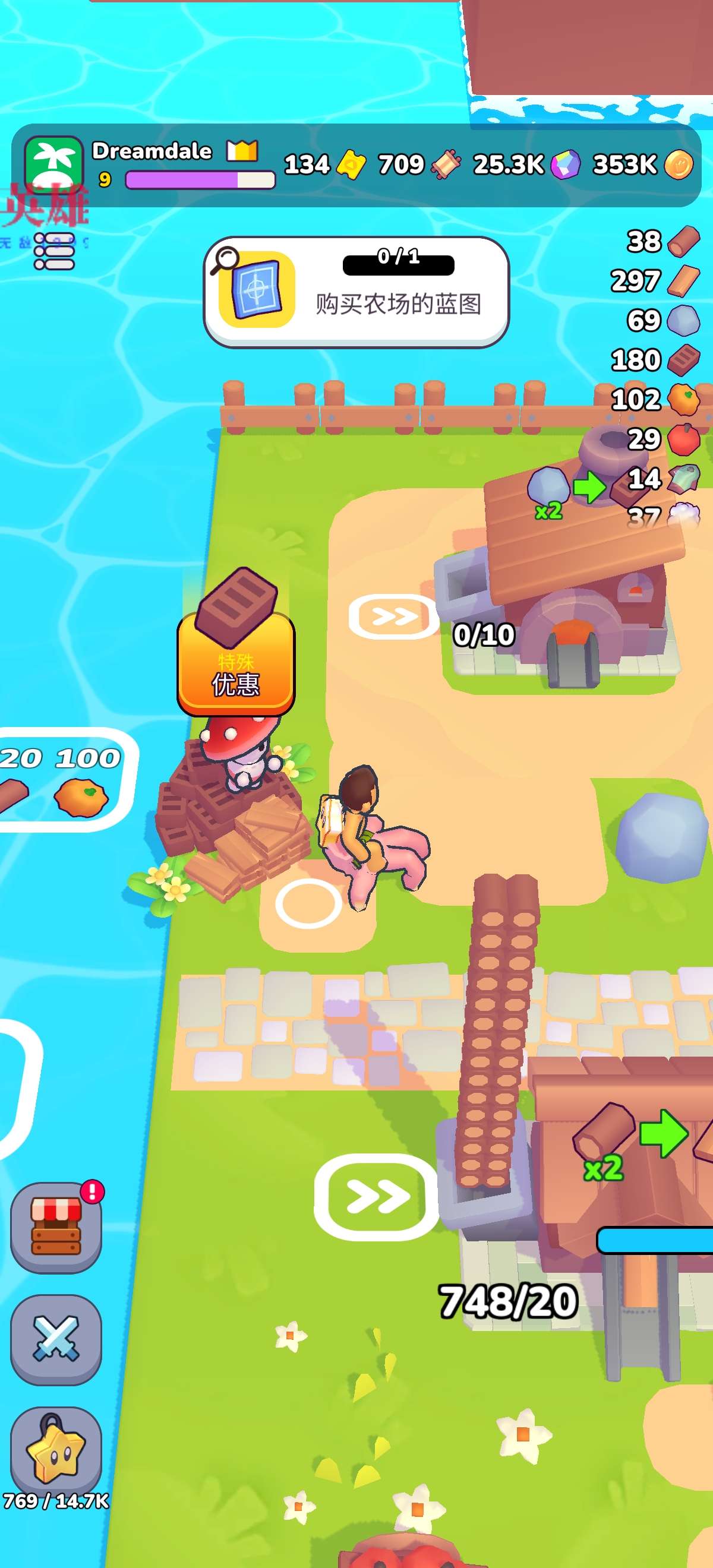 一位足智多谋的英雄:开局时一无所有,除了一个空荡荡的背包和你最信赖的斧头。你需要努力伐木、挖矿、采集资源,从而建造出新的建筑物,或是到市场上换取金币和钻石。你可以用金币来升级自己的装备和建筑物,也可以继续开拓地图,寻找更多种类的资源。
