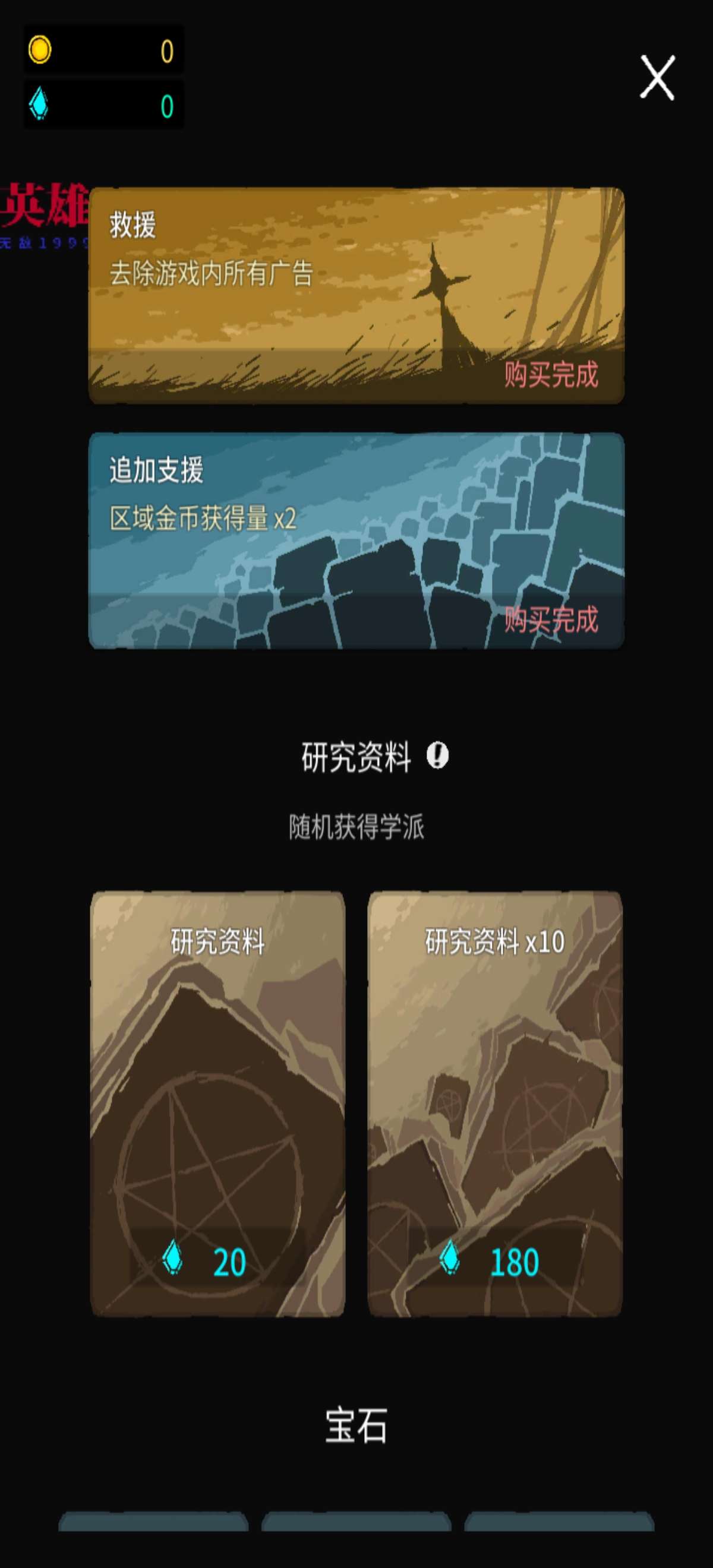 2.开局直接在最左下角的图标里面内购购买免广告、金币倍数以及宝石,之后就可以通过宝石购买研究材料和金币了