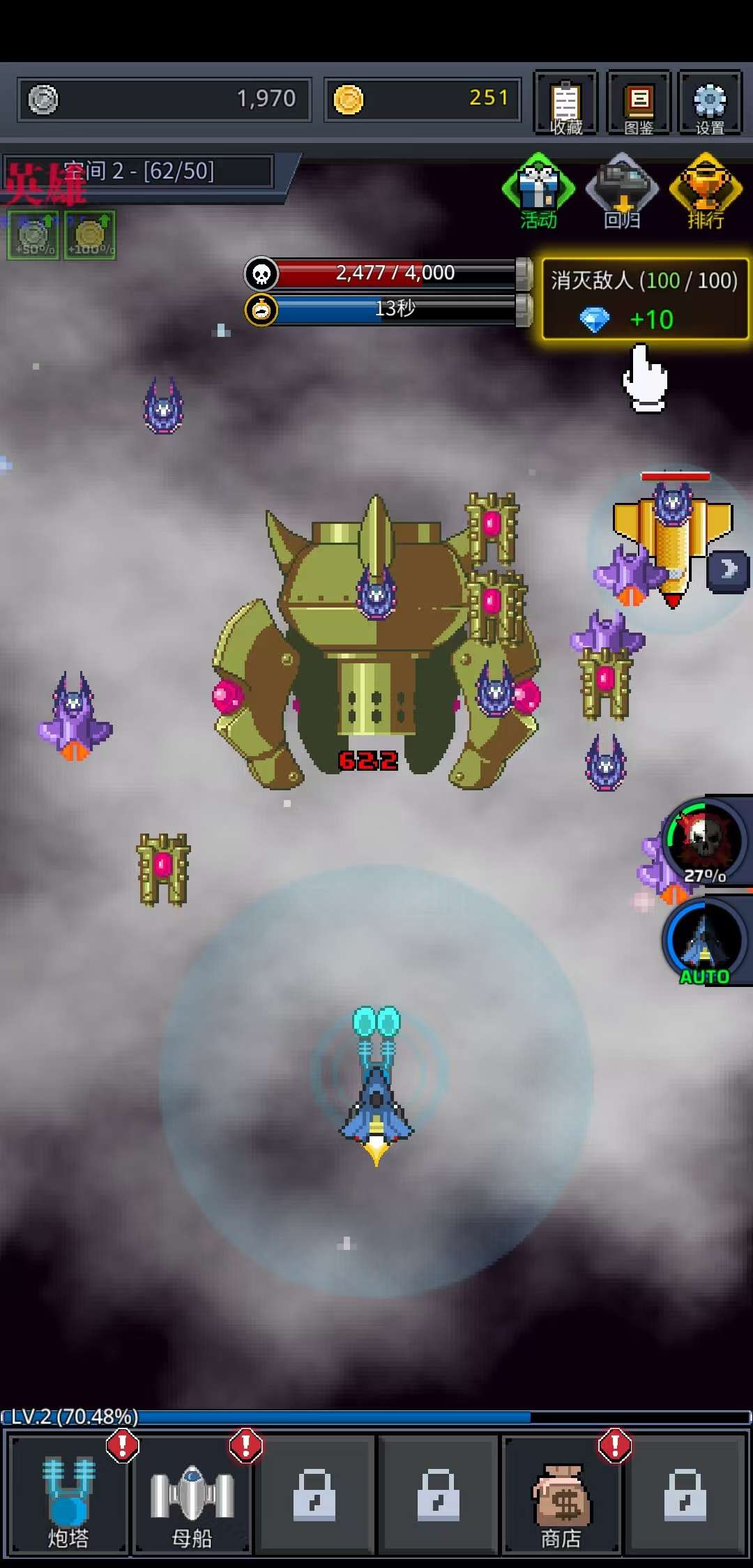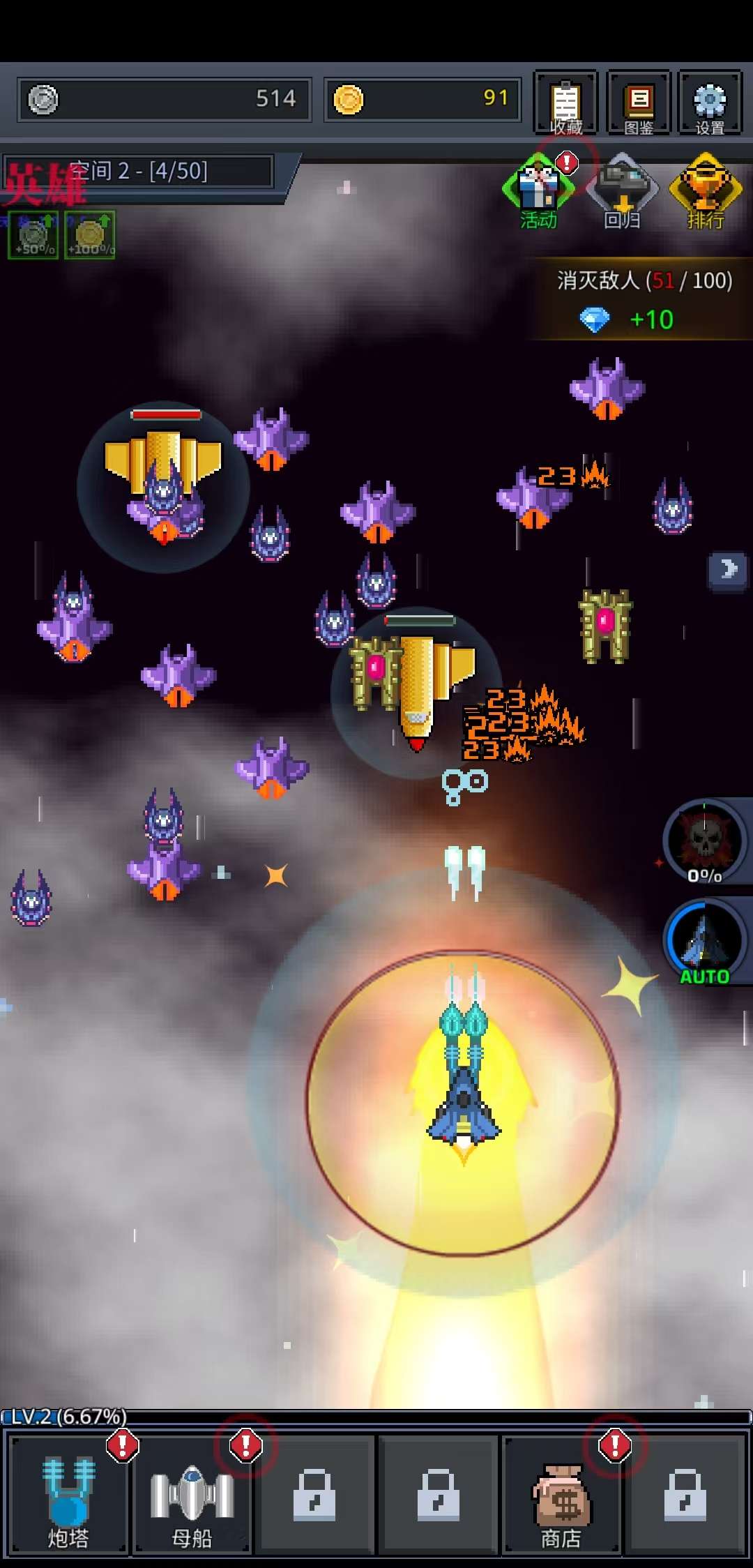 摧毁敌方飞船收集银和金,加强和扩大炮塔,创造最好的舰船