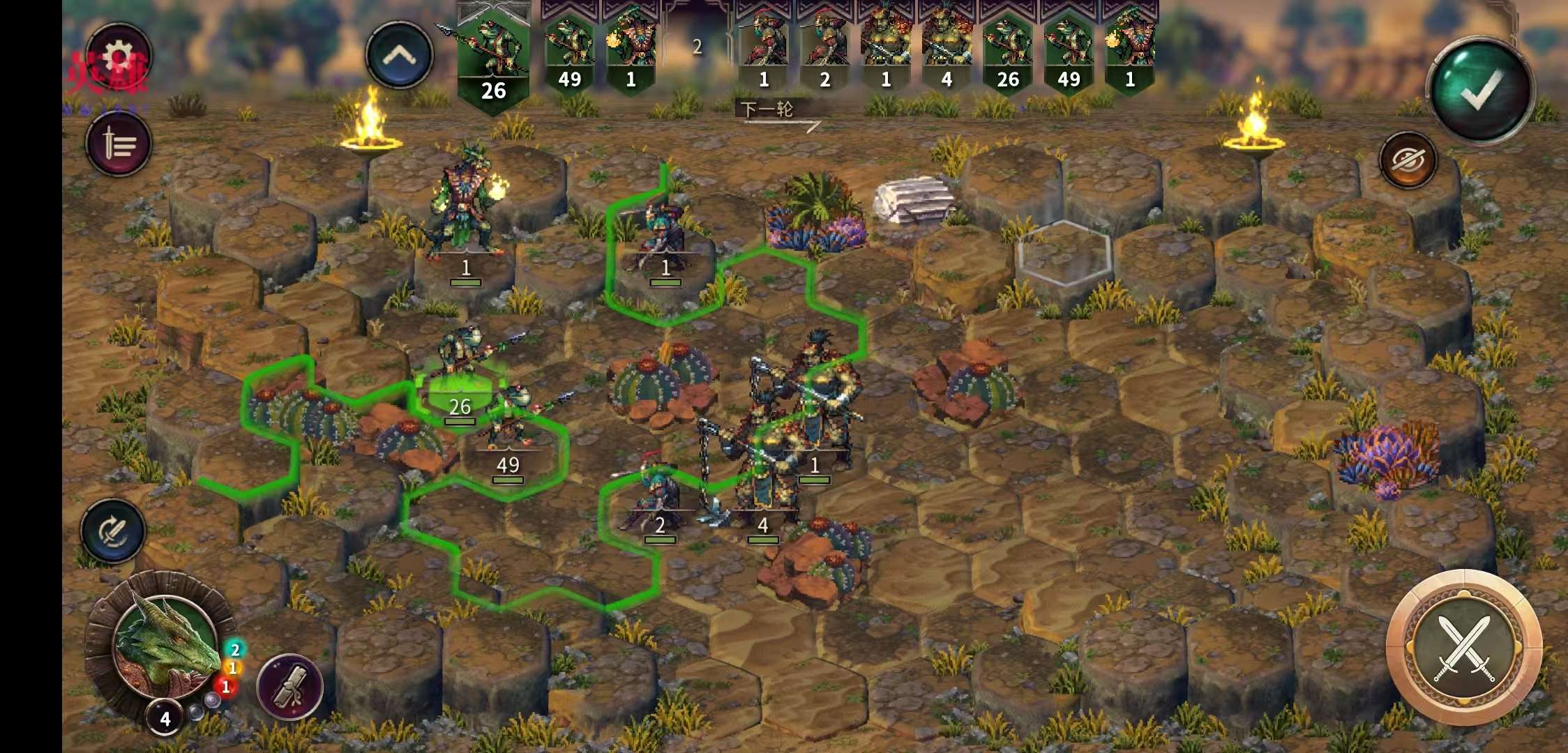 战术回合制战斗 - 领导军队纵横沙场。记住,每一步都很重要!使用魔法和武力巧胜对手。调整策略,指挥军队取得胜利。
