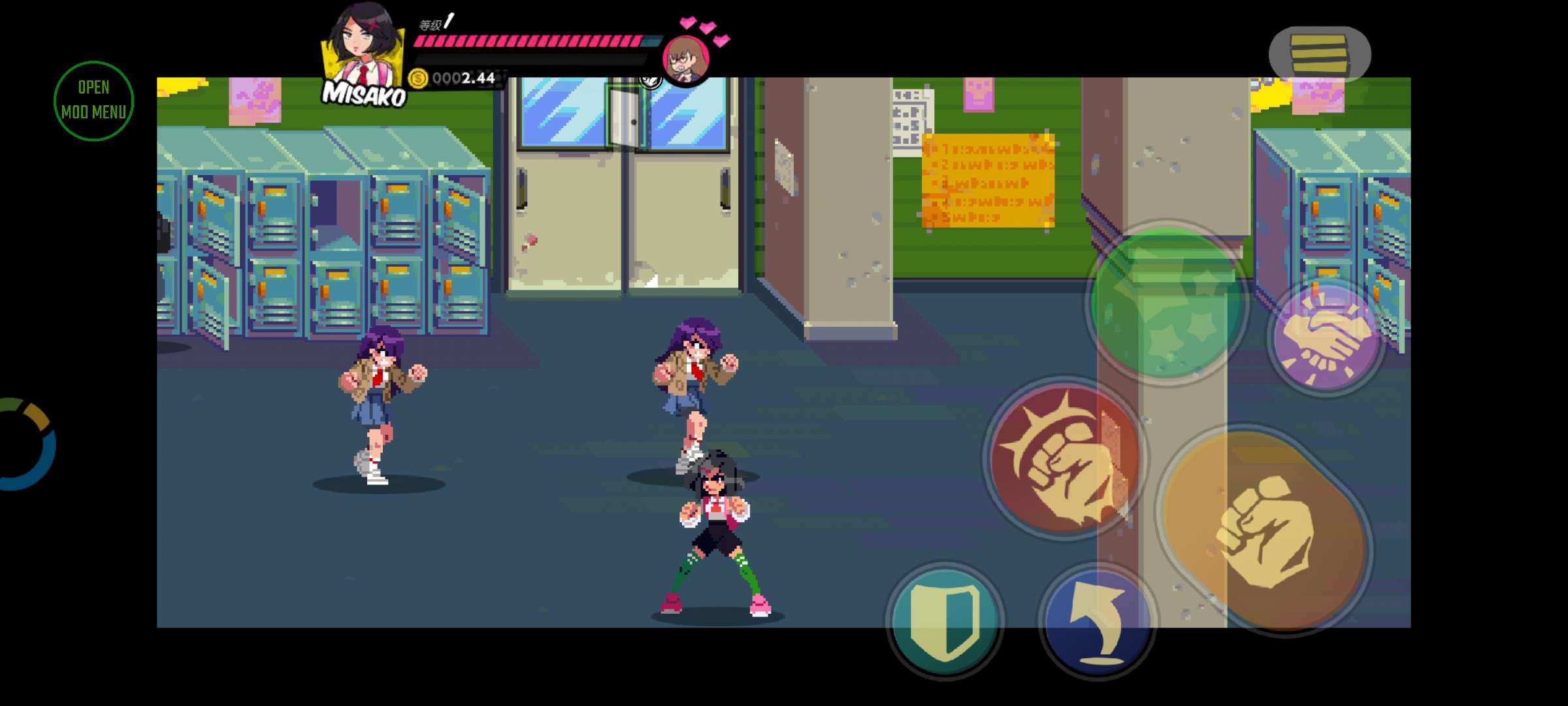 【游戏简介】河城的卑劣街头又出麻烦事了!劈头盖脸的女主角美沙子和京子正把整个河城搅个天翻地覆,只为拯救她们的男朋友国夫君和阿力,任何人都别想挡住她们的去路!在游戏中拳打南街、脚踢北巷,学会新的绝招,大吃增进精力的食物、挥舞摧枯拉朽般的武器,并使出一系列连招、投掷和特殊攻击,把坏蛋们打得哭爹喊娘!最棒的是,这一切全都以惊艳的16位画风呈现!炫酷的武打场景中,不仅穿插了漫画剧情面板、日式动画分镜、多种结局,还有超级帅气的合成电音配乐。游戏的这一版本还支持触屏或蓝牙手柄供单人游戏(双玩家合作需要使用蓝牙手柄)