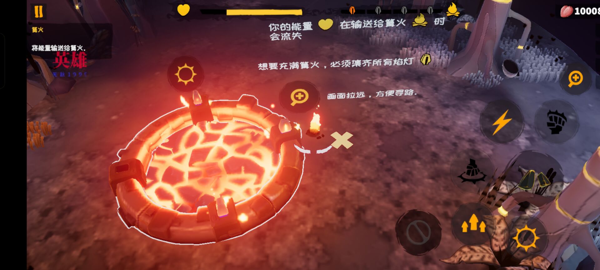 为了重燃永恒之火,你需要在每个区域搜寻残存的火种能量,并将它们输送回关卡中的火焰营地。但要注意:这些能量也代表你的生命值。你需要消耗能量来激活火焰营地,同时也要保持自身健康才能继续探索。找到最佳平衡点,探索属于你的独特游戏方式。