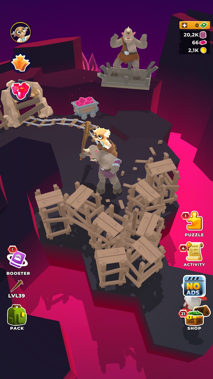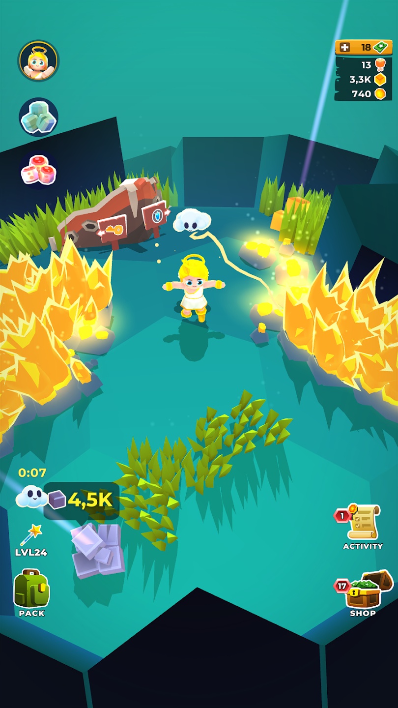 雷神有他的锤子,海王星有他的三叉戟,在这个游戏中,你有一把强大的鹤嘴锄,它既擅长击打怪物,也擅长打碎岩石、挖掘矿物和开采黄金。将其升级到八个不同的级别,以提高您的神圣生产力,并收获更多资源以继续建设。