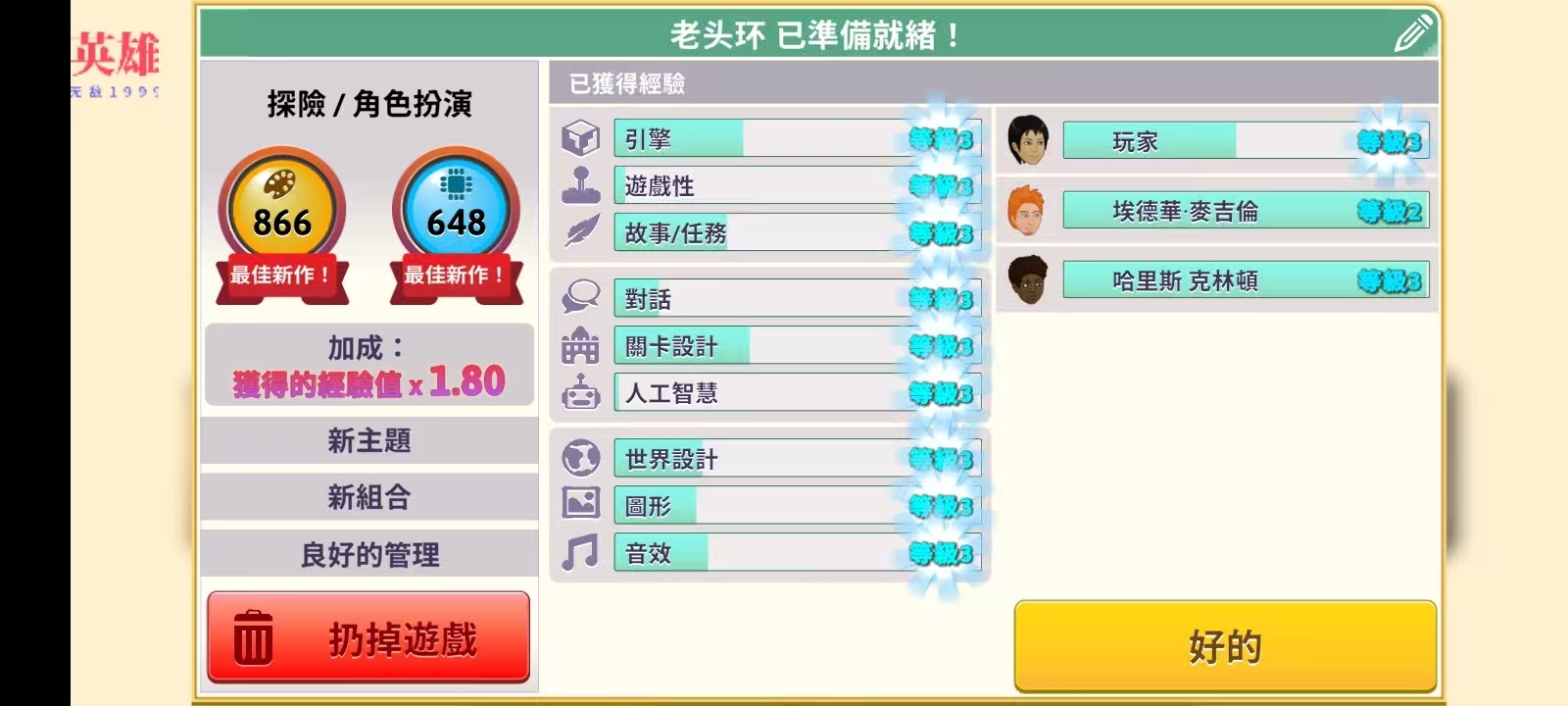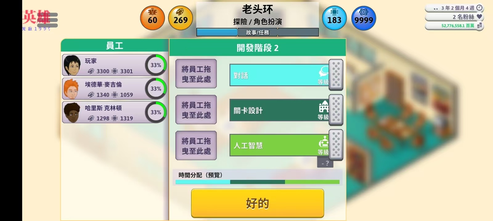 4)培训完成时全能力至少涨1000(能力尽量不要超过5000,否则开发一款游戏耗时将变得非常长)