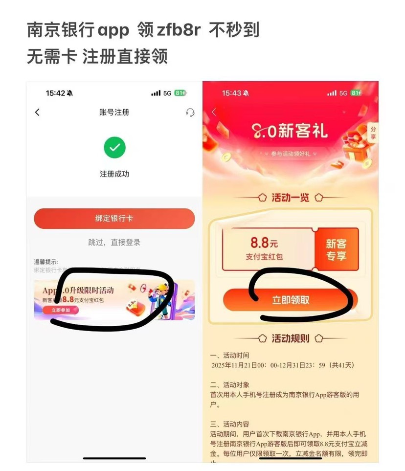 新人下载南京银行App,注册后点下方活动,或主页横幅进入活动
