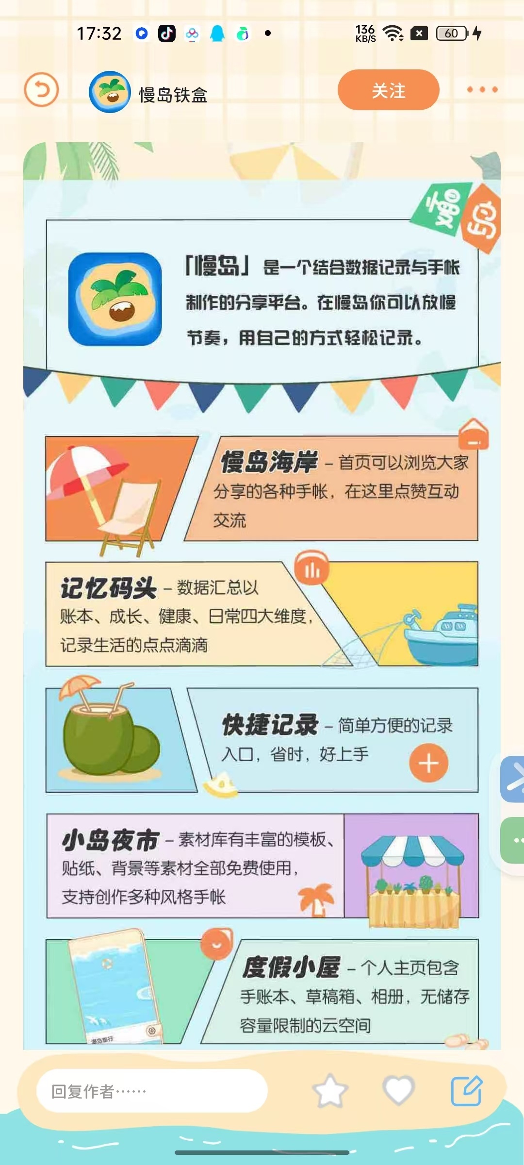 【资 源 介 绍】慢岛是融合数据记录与手帐创作的分享平台,支持多维度快捷记录,内容自动生成可视化图表。拥有丰富免费的创作素材、模板,可自由创作个性手帐。内置内容社区,能分享生活、交流兴趣,还提供不限容量的安全个人空间,让记录生活成为轻松治愈的体验