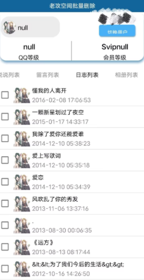 【资源名称】:空间批量删除助手【资源版本】:v1.0【资源大小】:1.57mb【测试机型】:iQOO neo5【资源介绍】:QQ空间说说留言日志相册太多逐个删太麻烦?使用空间删除助手,摆脱手动痛苦,一键批量删除,快速安排,省时省力。【资源截图】: