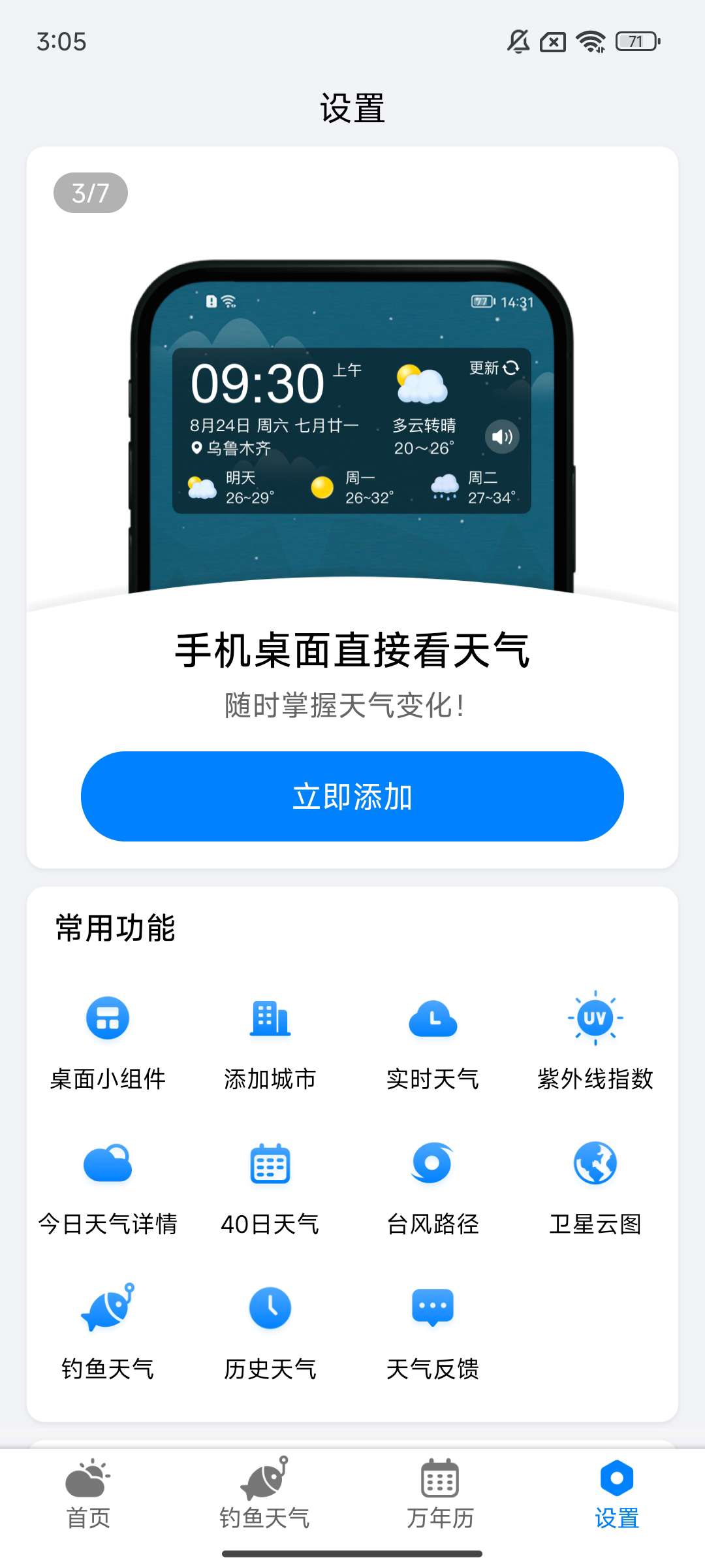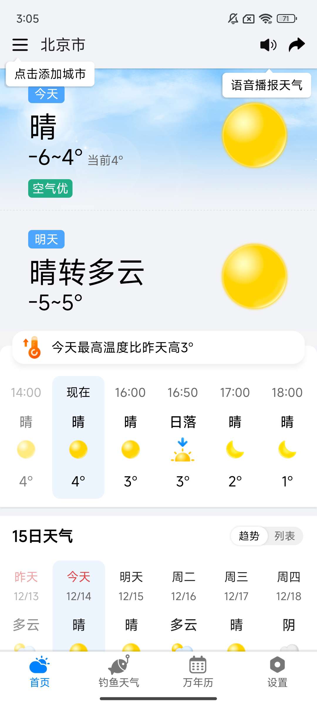 分钟级降雨预测:基于实时雷达数据追踪降水路径,可精确到“几点几分降雨/雨停”,帮助用户规避突发降雨。超长周期预报:提供未来24小时、15天及40天的天气趋势,覆盖短途出行与长期规划需求。街道级定位:突破传统区域预报局限,实现每条街道、小区的专属天气播报,解决“东边日头西边雨”的困扰。