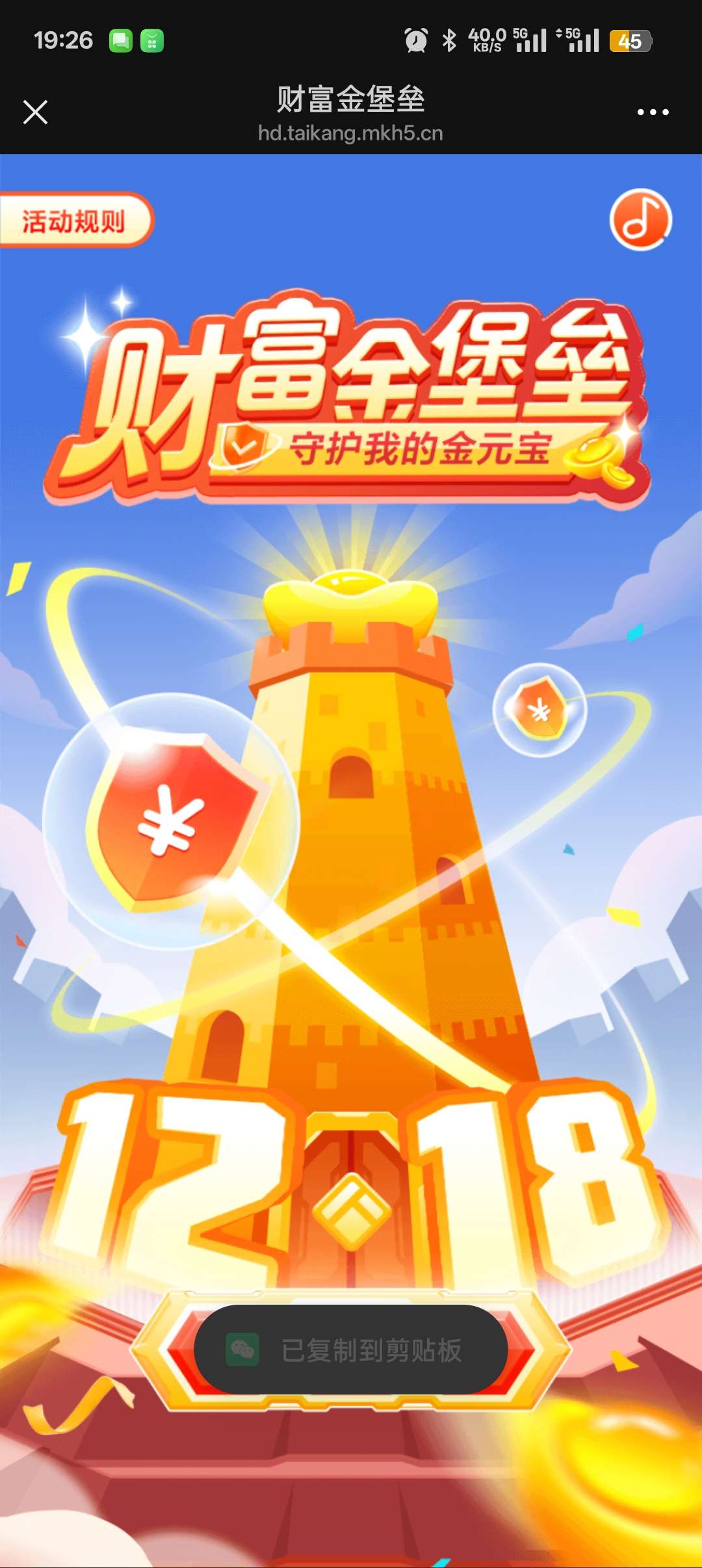 【参与方式】 https://hd.taikang.mkh5.cn/2025wealth/index.php?source1=WX&activityCode=scbWealthGoldFort2025&shareUnionid=oKS-RtwBEr26Ac5c9lviYXBbJlaA&shareOpenid=opKa3jglm5Om4K6wxDPU46FiggX8&shareId=opKa3jglm5Om4K6wxDPU46FiggX8&shareLevel=1&shareTime=1765711166000&agentId=&openid=opKa3jglm5Om4K6wxDPU46FiggX8&state=redict×tamp=20251214192619075&sign=&userInfo=%7B%22openId%22%3A%22opKa3jglm5Om4K6wxDPU46FiggX8%22%2C%22nickName%22%3A%22%E6%97%A0%E7%BC%98%22%2C%22sex%22%3A%220%22%2C%22province%22%3A%22%22%2C%22city%22%3A%22%22%2C%22country%22%3A%22%22%2C%22headImgUrl%22%3A%22https%3A%2F%2Fthirdwx.qlogo.cn%2Fmmopen%2Fvi_32%2FSHTqNNVB9maH438ic73Oe9F7UtY0ponOvsJEQRU2NypIdB7dO21W10NFPQibSTXBtyicZOYwK9MnOAeVBGdXvX8zw%2F132%22%2C%22unionId%22%3A%22oKS-RtwBEr26Ac5c9lviYXBbJlaA%22%7D