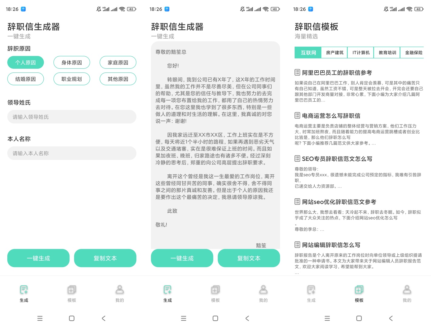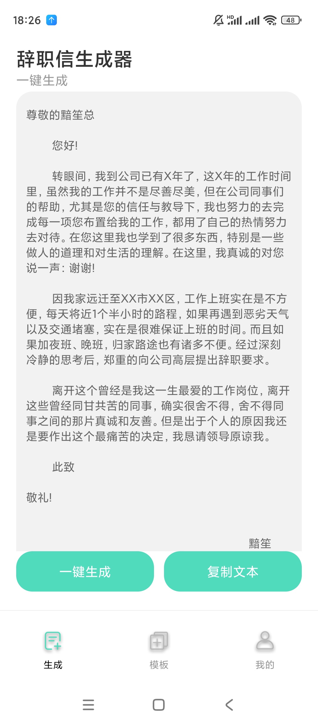 【官方介绍】:很多朋友准备离职不知道怎么写辞职信,这里分享一款超级神器,辞职信生成器,软件拥有丰富的功能,可以一键快速生成辞职信,可以根据个人原因,身体原因,结婚怀孕,职业规划和其他原因来生成辞职信,并且支持一键复制,所有的格式日期都有,将关键词改一下即可使用。