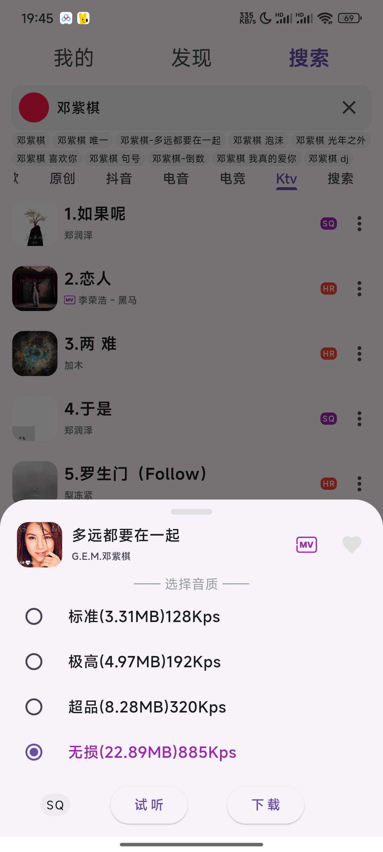 全音质选择,支持标准128Kps、极高192Kps、超品320Kps及无损885Kps音质,可按需试听或下载对应音质版本。