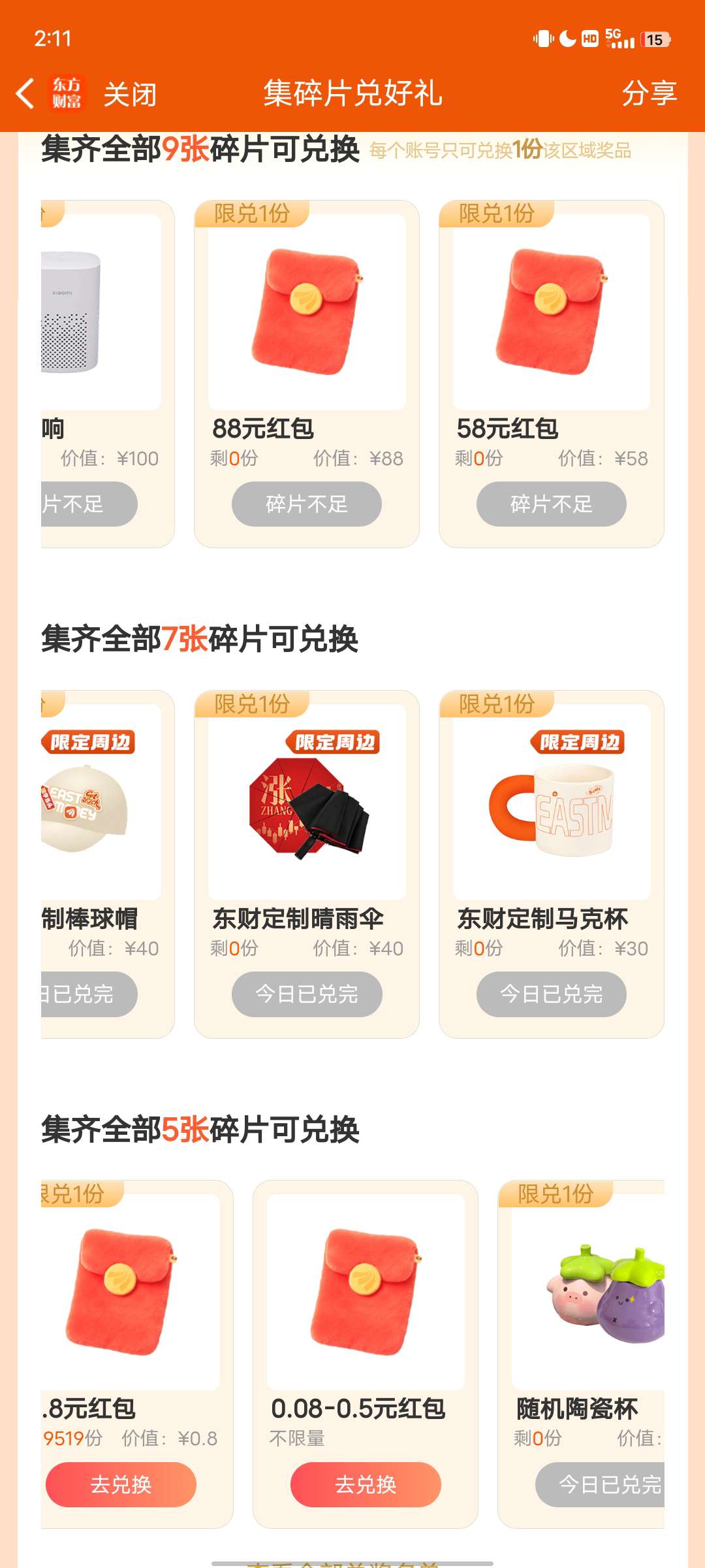 东方财富新活动 集齐 9 张碎片可以兑换红包