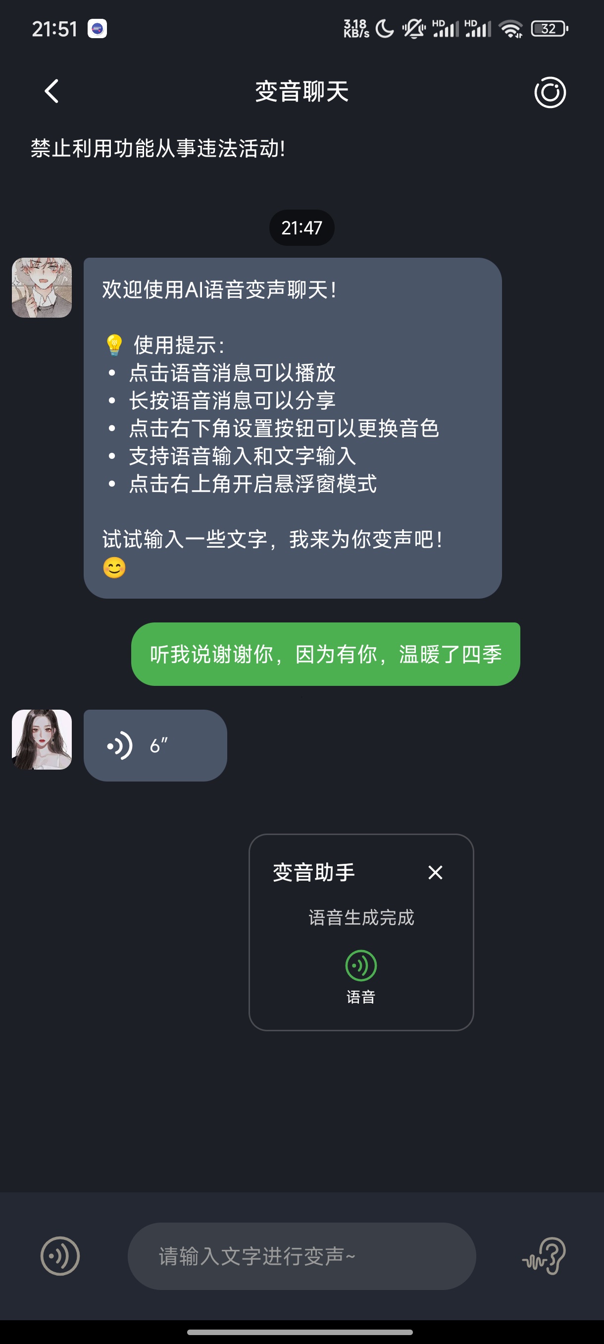 提供温柔男声、悬疑女声、阳光男声等多种音色,支持文字/语音输入变音,还能在变音聊天界面生成语音消息,适配游戏开黑等互动场景。