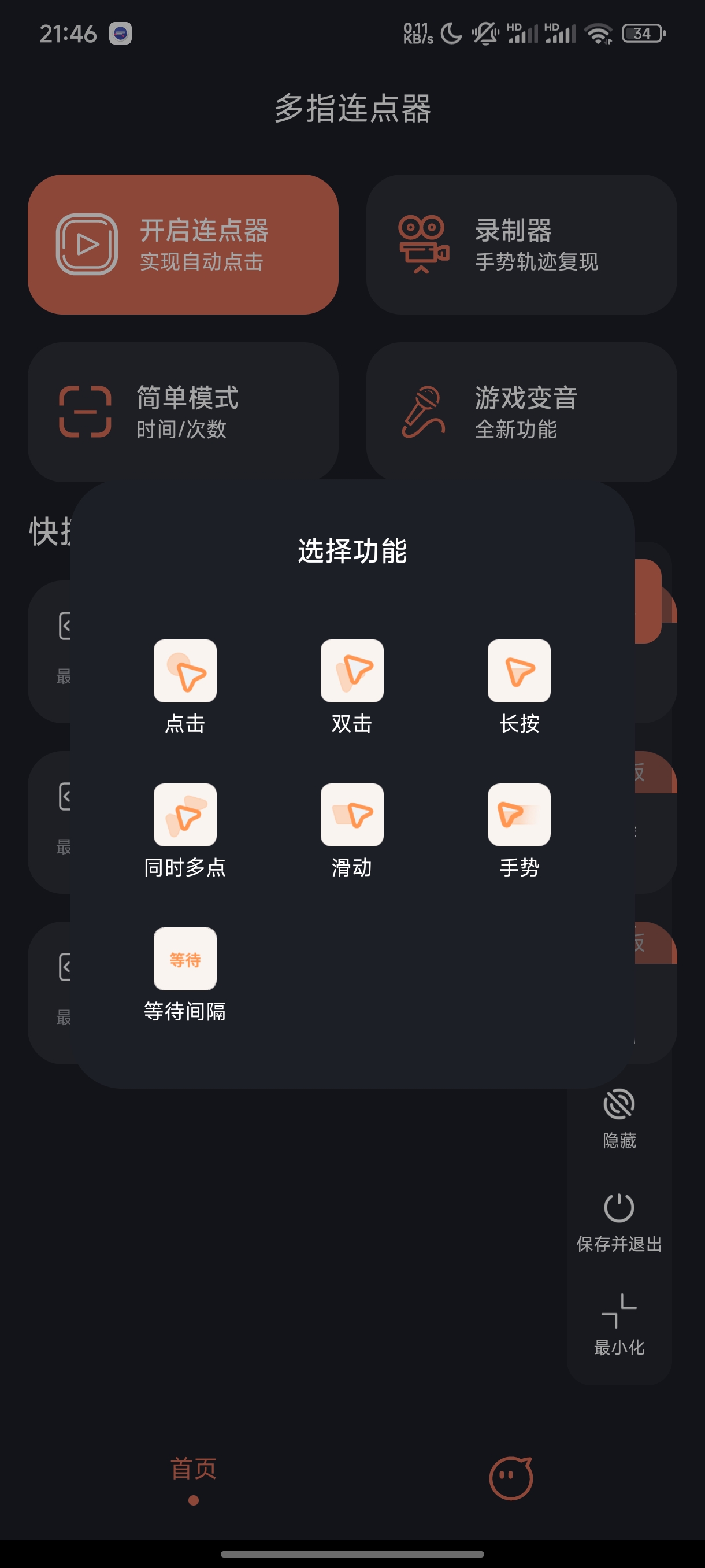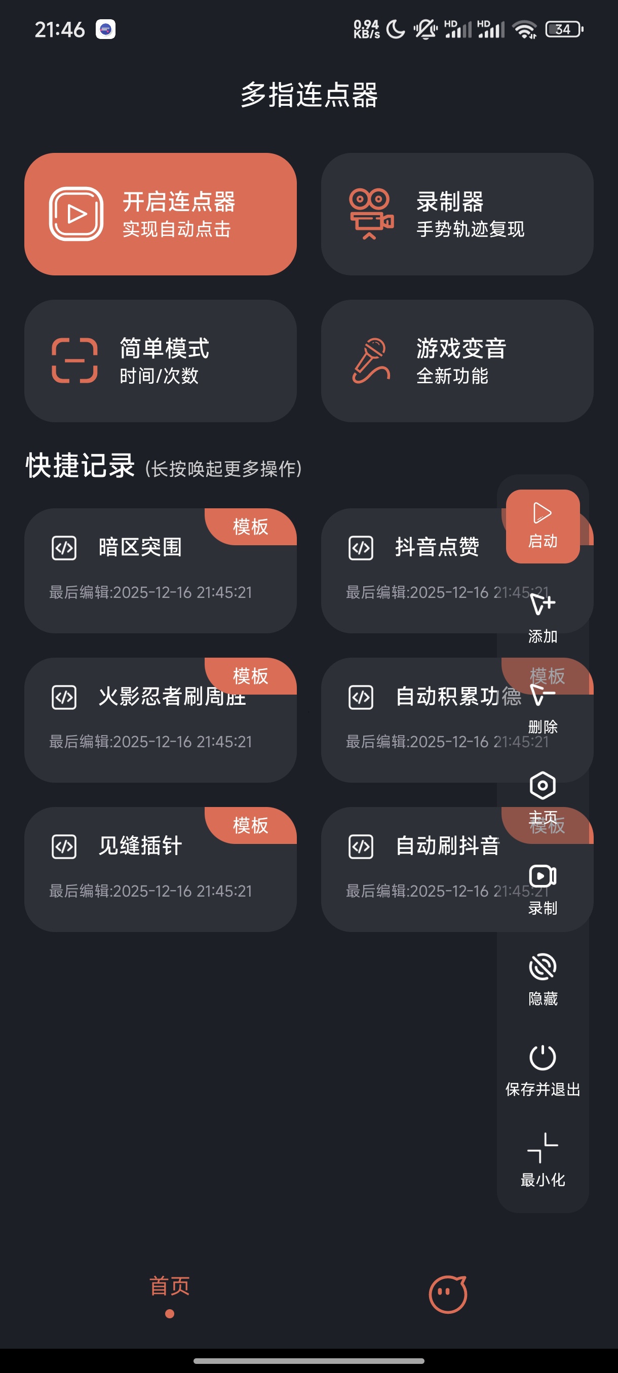 这款APP融合手势录制、游戏变音等附加功能,还具有游戏挂机点击反作弊功能