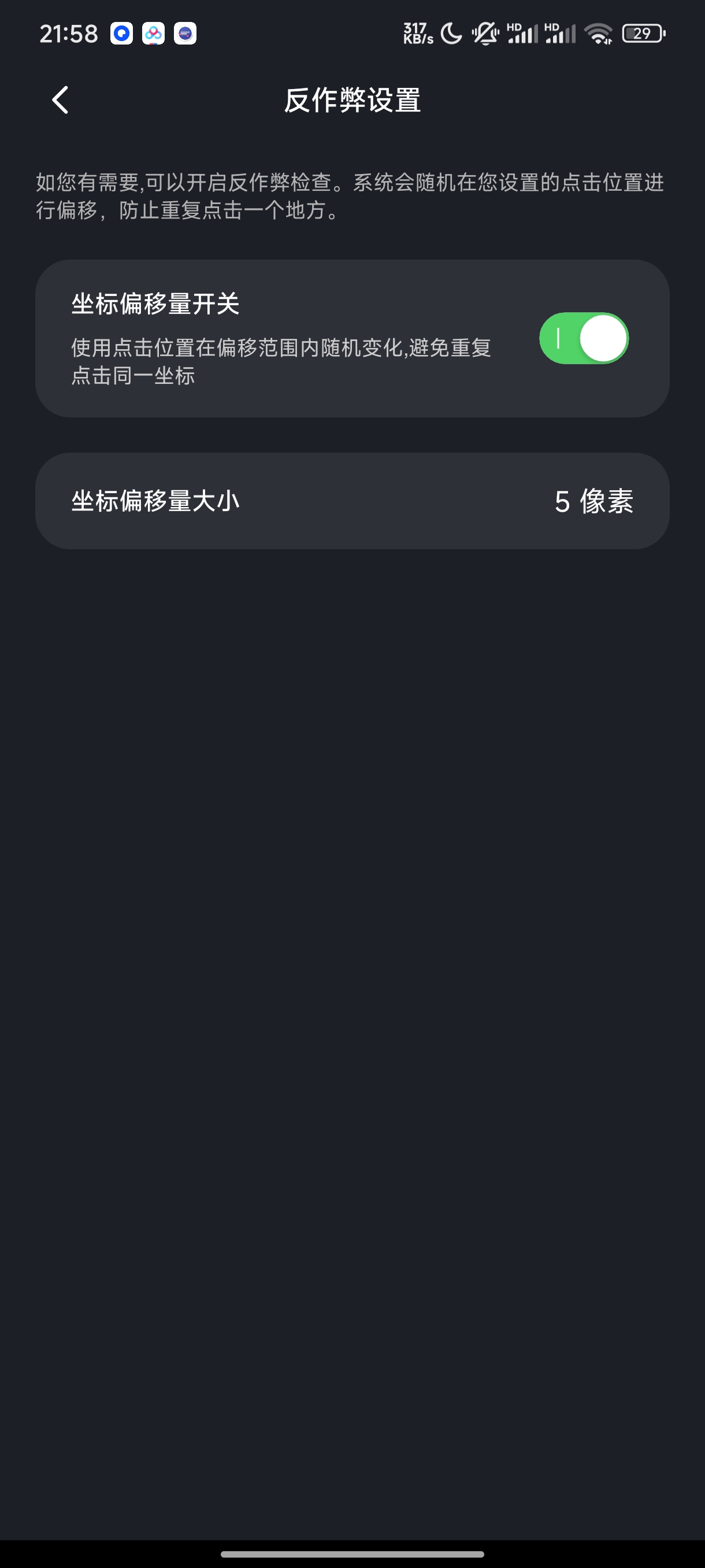 反作弊设置可开启坐标偏移,随机调整点击位置避免被检测,偏移量大小可自定义;