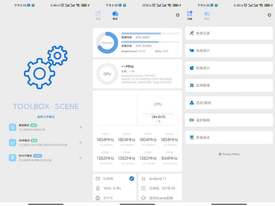 Scene5是一款功能强大的安卓系统辅助应用工具,为搭载了骁龙处理器的手机提供了各类优秀的系统优化功能,比如性能配置、耗电统计、CPU控制、进程管理、屏幕滤镜等,针对玩机人士使用,已解锁专业版!