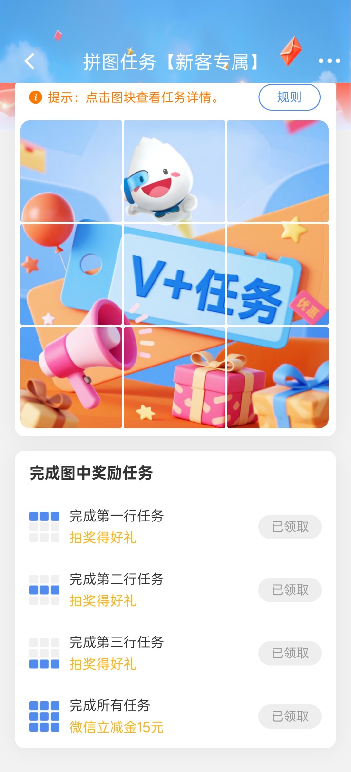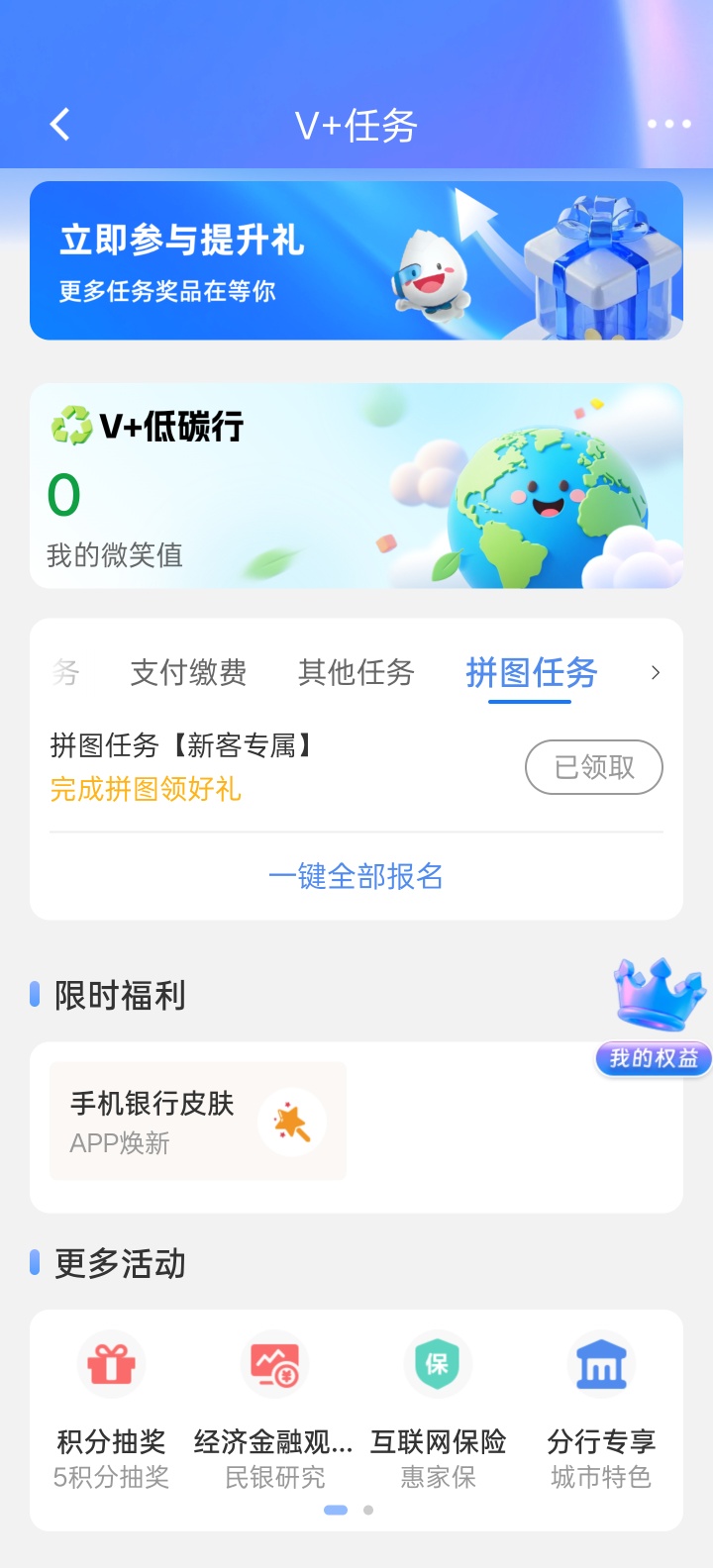 首页V+任务进去右划最后一个有拼图任务,不知道是不是所有都有,进去看几个15秒可以抽奖,完成所有任务可以领15元,电子账户和二类卡自测