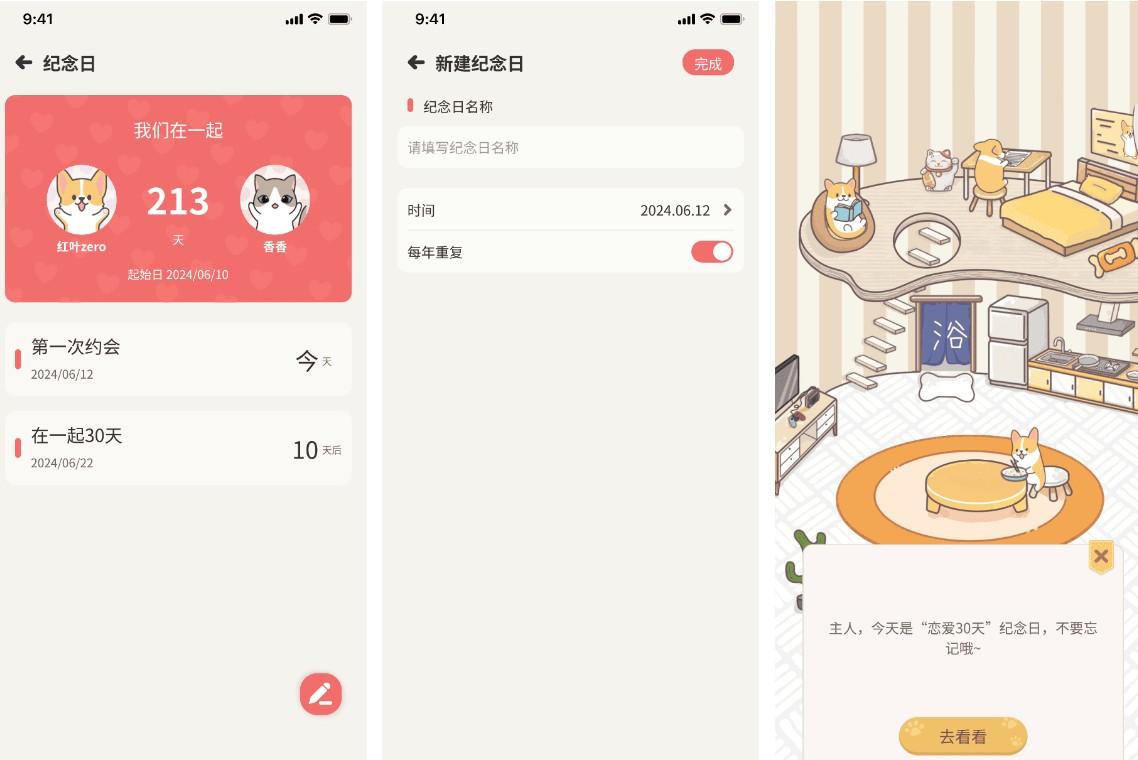 ①「萌宠养成」:情侣共同养宠,培育爱的结晶,萌宠是情侣间爱的桥梁。更有萌宠互动和纪念日、经期记录提醒哦~